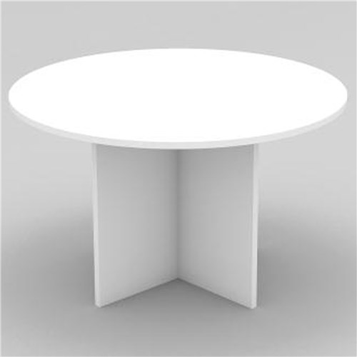 Round meeting table with stable cross base legs. Sturdy 25mm top over 25mm base. Comfortably seats 4 people. E1 grade melamine boards. 3 Year Manufacturer's Warranty. Delivery, installation and assembly charges may apply to furniture. Please enquire to confirm.