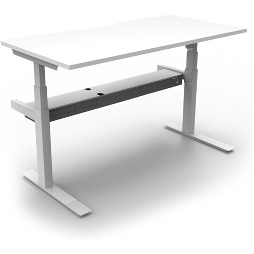 Paramount Single Sided Electric Height Adjustable Workstation 25mm T Natural White Table Top With 50mm D Scallop 1800mm W x 750mm D x 655mm - 1259mm H White P/C 3 Stage Frame - Single Heavy Duty Motor Includes Built In Cable Tray With Provisions For 4 GPO + 4 Data Per User E1 Rated Melamine Worksurface 100 KG Lifting Capacity Includes Drive Bar 5 Year Manufacturer's Warranty