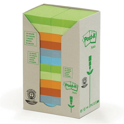 Post-it® 100% Recycled Towers are made from 100% recycled fibres. Recycled notes have the same adhesive performance quality as all of the standard Post-it® Notes. Provides environmentally conscious businesses with a green alternative. No individually plastic wrapped pads to minimise waste. 100 sheets per pad.