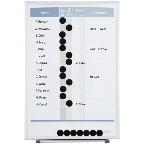 • Quartet Matrix In/Out boards are an ideal space saving way to keep track of personnel.