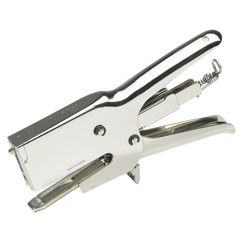 Powerful nickel-plated pliers with finger stop. Ideal for jiffy bags, small boxes etc. Perfect for post room, office and warehouse. Traditional back loading functionality. Staples up to 70 sheets of paper (80 gsm). Uses Rapid 73/8 73/10 and 73/12 staples. Regular stapling anvil for 6 to 12 mm staples. Stapling depth: 65mm. 5 Year Manufacturer's Warranty.