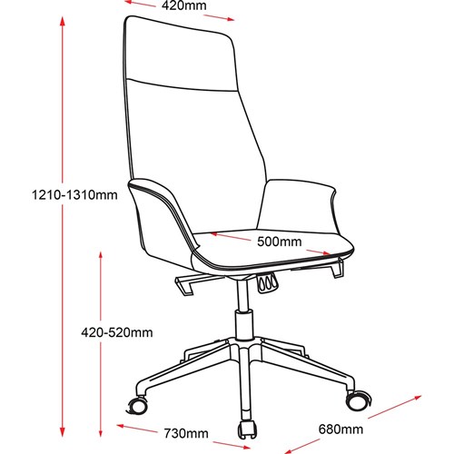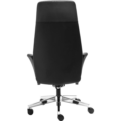 Black genuine leather. High back executive chair. Easy adjust tilt tension control. Heavy duty tilt mechanism. Polished aluminium 5 star base on castors. Delivery, installation and assembly charges may apply to furniture. Please enquire to confirm.