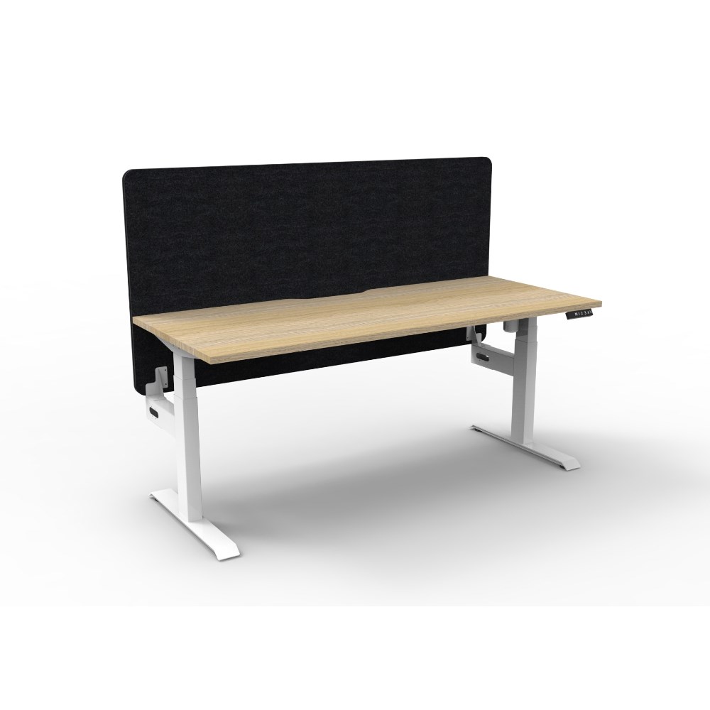 • Electric height adjustable single sided workstation with Natural Oak top and White Satin frame, Black Eco screen.