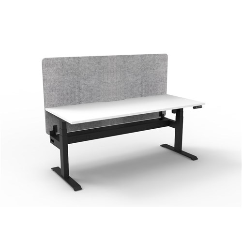 Electric height adjustable single sided workstation with Natural White top and Black Satin frame, Grey Eco screen and cable tray. Unit Dimension: 1800W x 750D x 1330mmH (Overall). Desk Height: 620-1270mmH. Eco panel screen 1800W x 900H x 27mmT. Fully ducted cable tray with punchout for power and data to be fitted to either external or internal of frame. 80mm rear scallop cut out. E0 rated 25mm top. Single motor underframe finished in powder coat with steel gauges 3.0mm, 2.0mm and 1.5mm. Digital control panel with 3 preset positions, LED display, keypad safety lock and reminder alarm. Anti-collision and anti-tilt technology. Lifting capacity 80kg, max speed 25mm per second. Noise emission