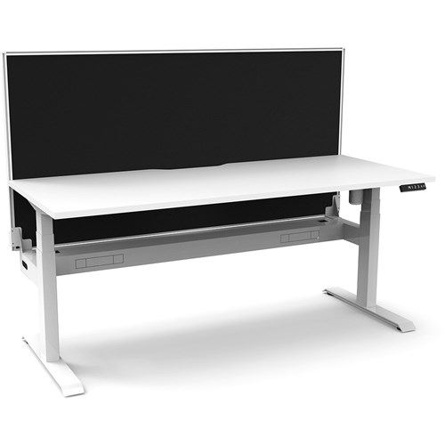 White top with White frame. Unit Dimension: 1200mm W x 750mm D x 1330mm H. 620-1270mm height range for desk. E0 rated top. Powdercoat base. Digital control panel with 3 pre-set positions, LED display panel, keypad safety lock & reminder alarm setting. Anti-collision technology, noise emission of less than 50DB. Lifting capacity of 80kg with a max speed of 25mm per second. 700mm wide foot size with adjustable leveling feet. Comes with 30mm thick privacy screens and cable tray for cable management. 10 Year Manufacturer's Warranty. Delivery, installation and assembly charges may apply to furniture. Please enquire to confirm.