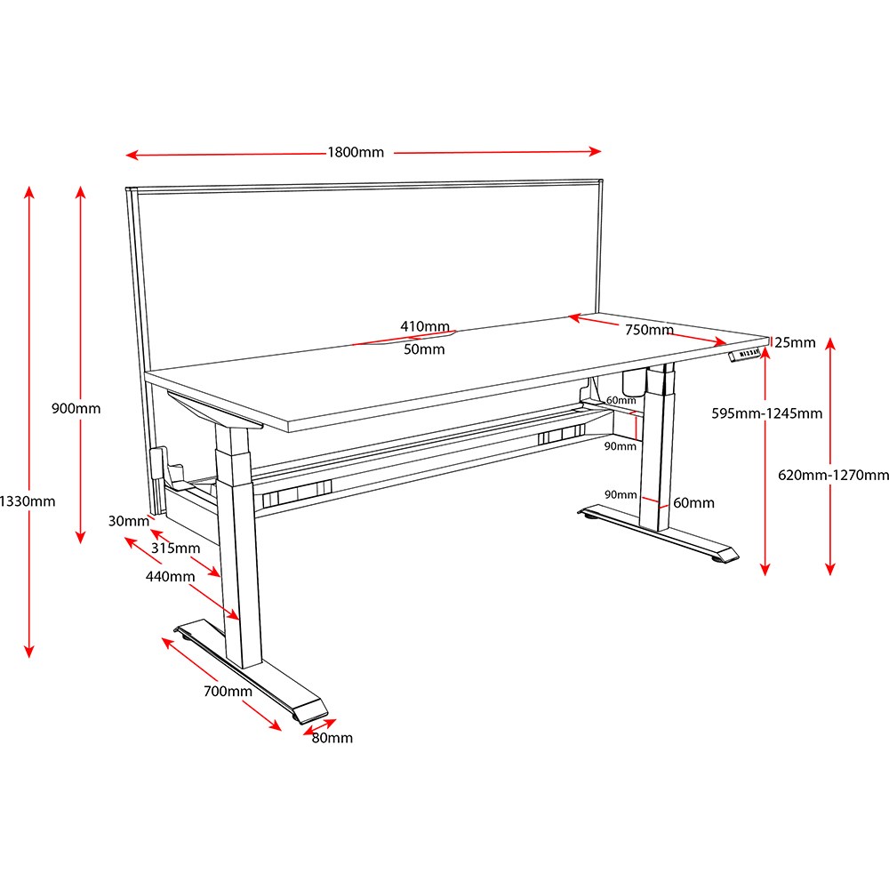 White top with Black frame. Unit Dimension: 1800mm W x 750mm D x 620-1270mm H. Comes with cable tray for cable management. E0 rated top. Powdercoat base. Digital control panel with 3 pre-set positions, LED display panel, keypad safety lock & reminder alarm setting. Anti-collision technology, noise emission of less than 50DB. Lifting capacity of 80kg with a max speed of 25mm per second. 700mm wide foot size with adjustable leveling feet. 10 Year Manufacturer's Warranty. Delivery, installation and assembly charges may apply to furniture. Please enquire to confirm.