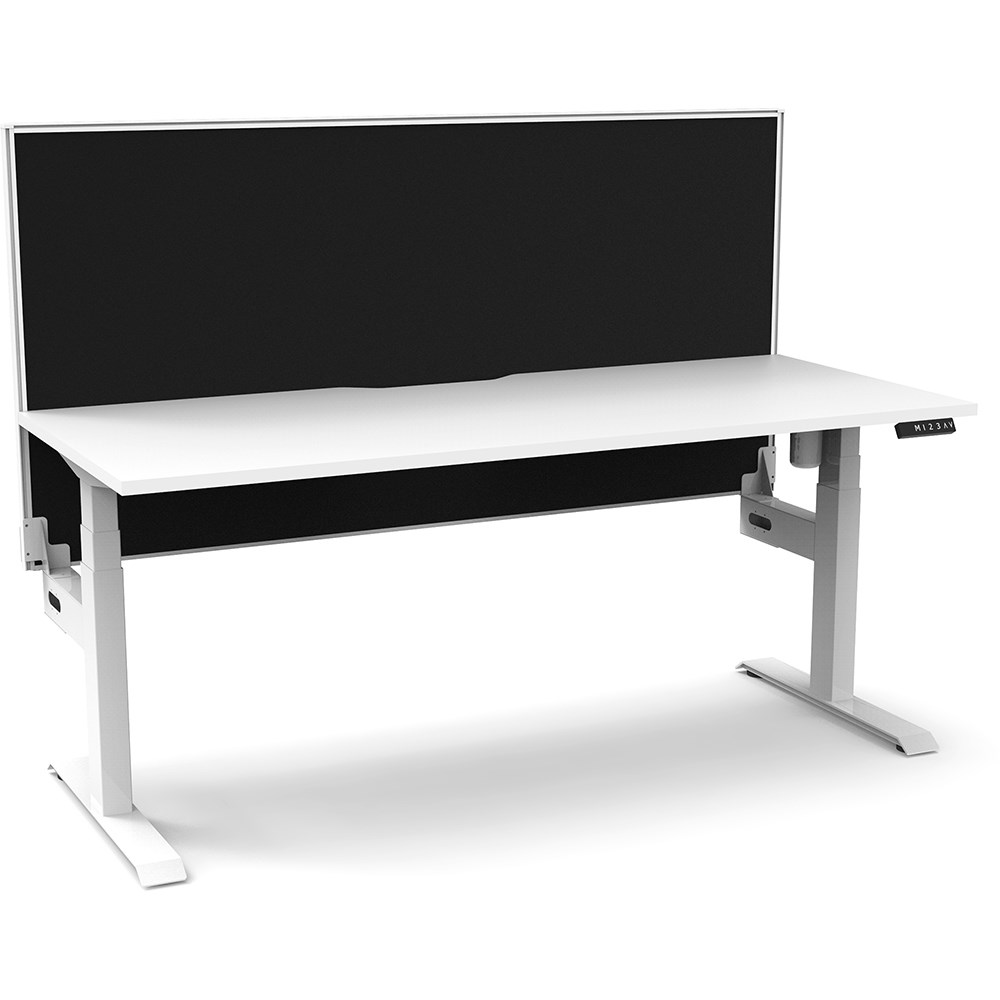 White top with White frame. Unit Dimension: 1200mm W x 750mm D x 1330mm H. 620-1270mm height range for desk. E0 rated top. Powdercoat base. Digital control panel with 3 pre-set positions, LED display panel, keypad safety lock & reminder alarm setting. Anti-collision technology, noise emission of less than 50DB. Lifting capacity of 80kg with a max speed of 25mm per second. 700mm wide foot size with adjustable leveling feet. Comes with 30mm thick privacy screen. 10 Year Manufacturer's Warranty. Delivery, installation and assembly charges may apply to furniture. Please enquire to confirm.