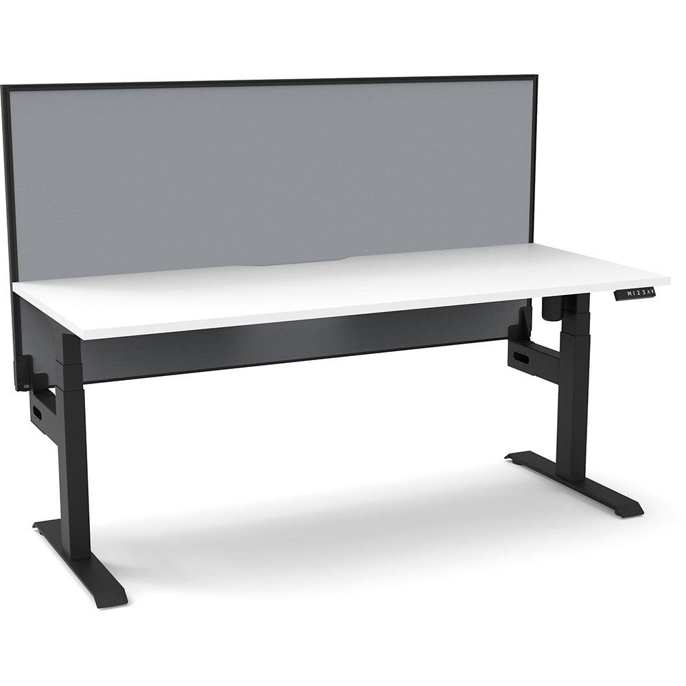White top with Black frame. Unit Dimension: 1500mm W x 750mm D x 1330mm H. 620-1270mm height range for desk. E0 rated top. Powdercoat base. Digital control panel with 3 pre-set positions, LED display panel, keypad safety lock & reminder alarm setting. Anti-collision technology, noise emission of less than 50DB. Lifting capacity of 80kg with a max speed of 25mm per second. 700mm wide foot size with adjustable leveling feet. Comes with 30mm thick privacy screen. 10 Year Manufacturer's Warranty. Delivery, installation and assembly charges may apply to furniture. Please enquire to confirm.