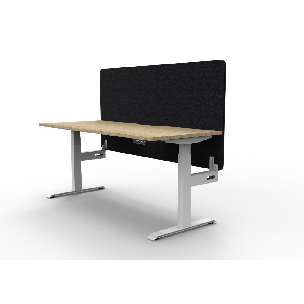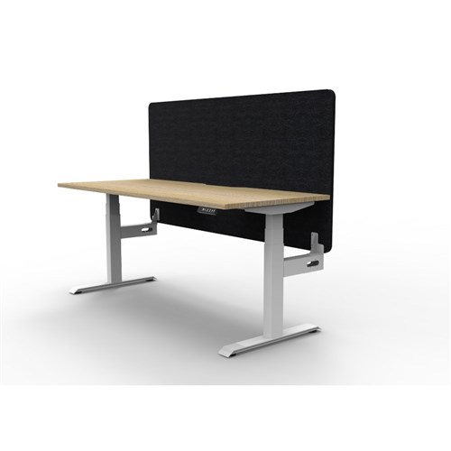 Natural Oak top with rigid edging and 50mm deep scallop cut out. White Satin powder coat frame. Eco screen. Dimensions: 1200W x 750D x 620-1270mmH. Overall Height AFFL including screen 1330mmH. Black 1200W x 900H x 27mmT Eco Panel Screen. E0 25mmT rated top. Column size: 90mm x 60mm. Digital control panel with 3 presets, LED display, keypad safety lock and reminder alarm. Dual motor with anti-collision and anti-tilt technology. Lifting capacity 120kg, max speed 38mm per second. Adjustable levelling feet, foot size 700mm, desk mounting top plate size 500mm, steel gauge 3.0mm, 2.0mm and 1.5mm used throughout. Noise emission