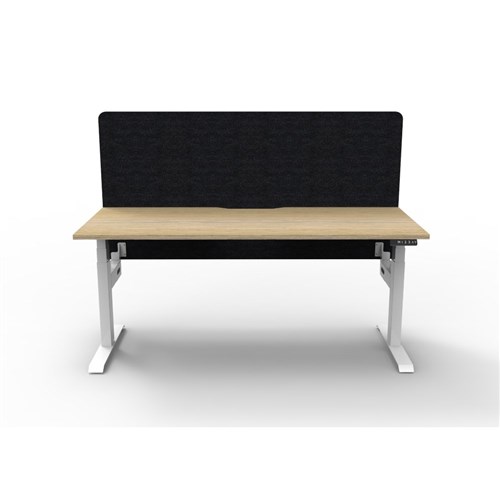 Natural Oak top with rigid edging and 50mm deep scallop cut out. White Satin powder coat frame. Eco screen. Dimensions: 1500W x 750D x 620-1270mmH. Overall Height AFFL including screen 1330mmH. Black 1500W x 900H x 27mmT Eco Panel Screen. E0 25mmT rated top. Column size: 90mm x 60mm. Digital control panel with 3 presets, LED display, keypad safety lock and reminder alarm. Dual motor with anti-collision and anti-tilt technology. Lifting capacity 120kg, max speed 38mm per second. Adjustable levelling feet, foot size 700mm, desk mounting top plate size 500mm, steel gauge 3.0mm, 2.0mm and 1.5mm used throughout. Noise emission