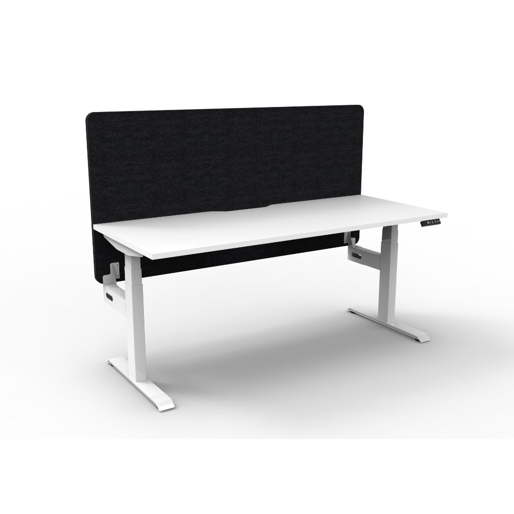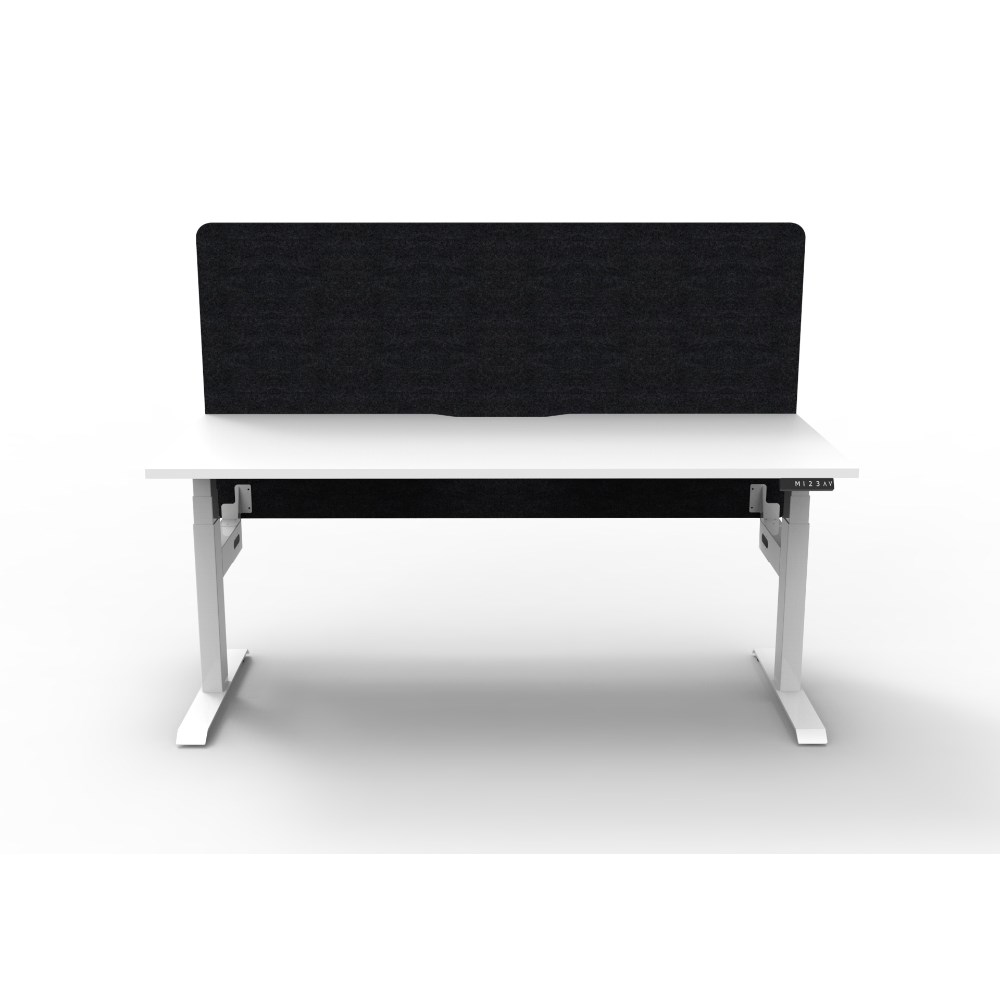 Natural White top with rigid edging and 50mm deep scallop cut out. White Satin powder coat frame. Eco screen. Dimensions: 1500W x 750D x 620-1270mmH. Overall Height AFFL including screen 1330mmH. Black 1500W x 900H x 27mmT Eco Panel Screen. E0 25mmT rated top. Column size: 90mm x 60mm. Digital control panel with 3 presets, LED display, keypad safety lock and reminder alarm. Dual motor with anti-collision and anti-tilt technology. Lifting capacity 120kg, max speed 38mm per second. Adjustable levelling feet, foot size 700mm, desk mounting top plate size 500mm, steel gauge 3.0mm, 2.0mm and 1.5mm used throughout. Noise emission