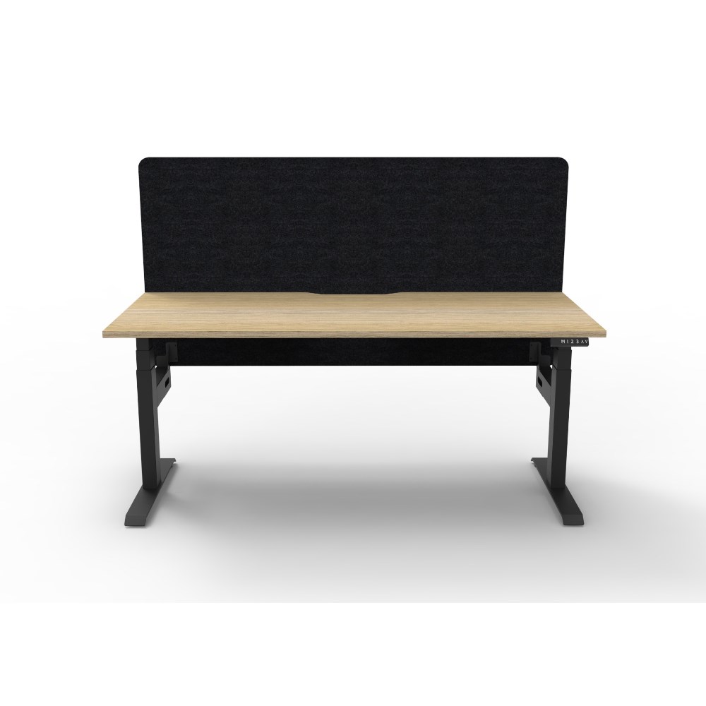 Natural Oak top with rigid edging and 50mm deep scallop cut out. Black Satin powder coat frame. Eco screen. Dimensions: 1800W x 750D x 620-1270mmH. Overall Height AFFL including screen 1330mmH. Black 1800W x 900H x 27mmT Eco Panel Screen. E0 25mmT rated top. Column size: 90mm x 60mm. Digital control panel with 3 presets, LED display, keypad safety lock and reminder alarm. Dual motor with anti-collision and anti-tilt technology. Lifting capacity 120kg, max speed 38mm per second. Adjustable levelling feet, foot size 700mm, desk mounting top plate size 500mm, steel gauge 3.0mm, 2.0mm and 1.5mm used throughout. Noise emission