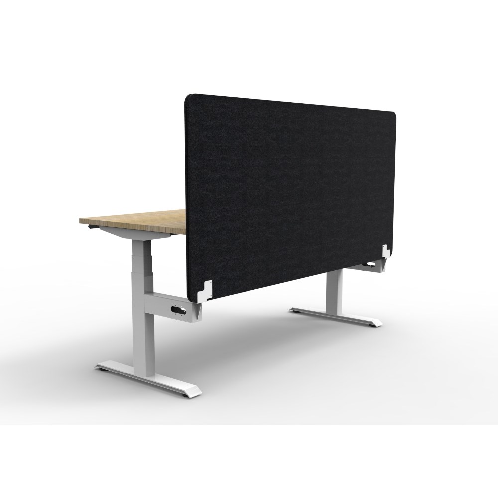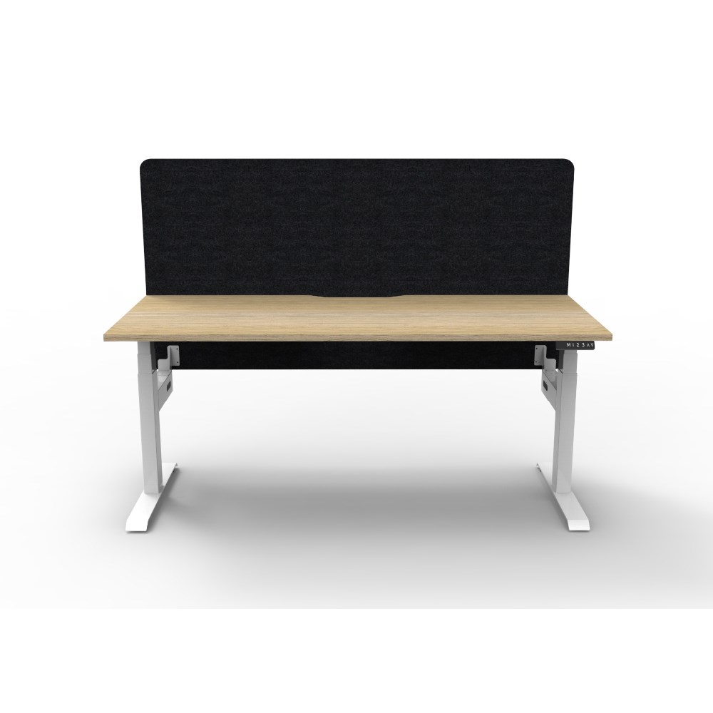 Natural Oak top with rigid edging and 50mm deep scallop cut out. White Satin powder coat frame. Eco screen. Dimensions: 1800W x 750D x 620-1270mmH. Overall Height AFFL including screen 1330mmH. Black 1800W x 900H x 27mmT Eco Panel Screen. E0 25mmT rated top. Column size: 90mm x 60mm. Digital control panel with 3 presets, LED display, keypad safety lock and reminder alarm. Dual motor with anti-collision and anti-tilt technology. Lifting capacity 120kg, max speed 38mm per second. Adjustable levelling feet, foot size 700mm, desk mounting top plate size 500mm, steel gauge 3.0mm, 2.0mm and 1.5mm used throughout. Noise emission