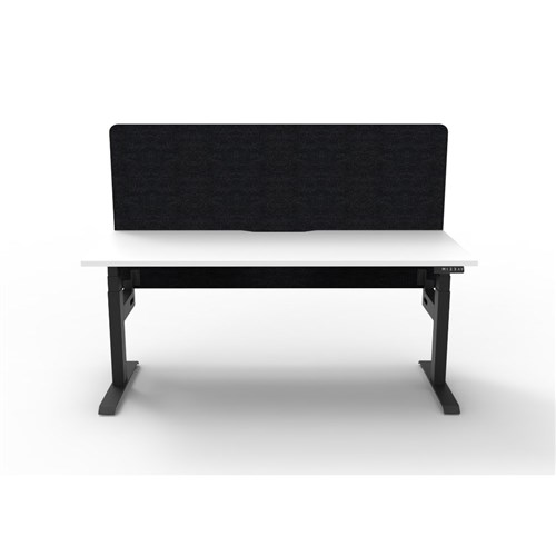 Natural White top with rigid edging and 50mm deep scallop cut out. Black Satin powder coat frame. Eco screen. Dimensions: 1800W x 750D x 620-1270mmH. Overall Height AFFL including screen 1330mmH. Black 1800W x 900H x 27mmT Eco Panel Screen. E0 25mmT rated top. Column size: 90mm x 60mm. Digital control panel with 3 presets, LED display, keypad safety lock and reminder alarm. Dual motor with anti-collision and anti-tilt technology. Lifting capacity 120kg, max speed 38mm per second. Adjustable levelling feet, foot size 700mm, desk mounting top plate size 500mm, steel gauge 3.0mm, 2.0mm and 1.5mm used throughout. Noise emission
