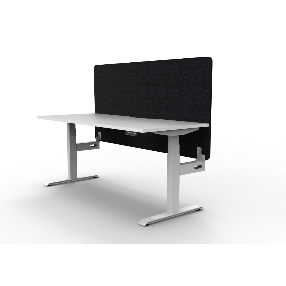Natural White top with rigid edging and 50mm deep scallop cut out. White Satin powder coat frame. Eco screen. Dimensions: 1800W x 750D x 620-1270mmH. Overall Height AFFL including screen 1330mmH. Black 1800W x 900H x 27mmT Eco Panel Screen. E0 25mmT rated top. Column size: 90mm x 60mm. Digital control panel with 3 presets, LED display, keypad safety lock and reminder alarm. Dual motor with anti-collision and anti-tilt technology. Lifting capacity 120kg, max speed 38mm per second. Adjustable levelling feet, foot size 700mm, desk mounting top plate size 500mm, steel gauge 3.0mm, 2.0mm and 1.5mm used throughout. Noise emission