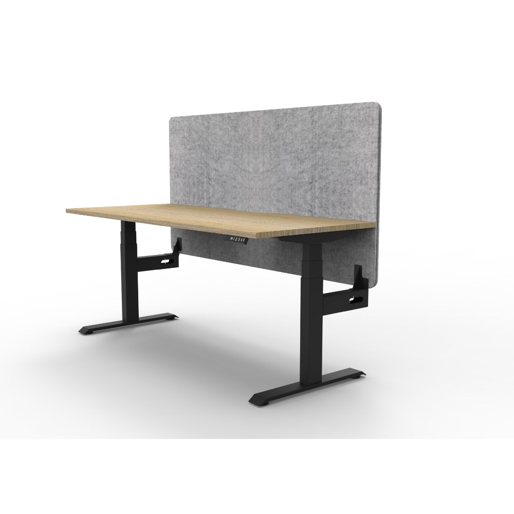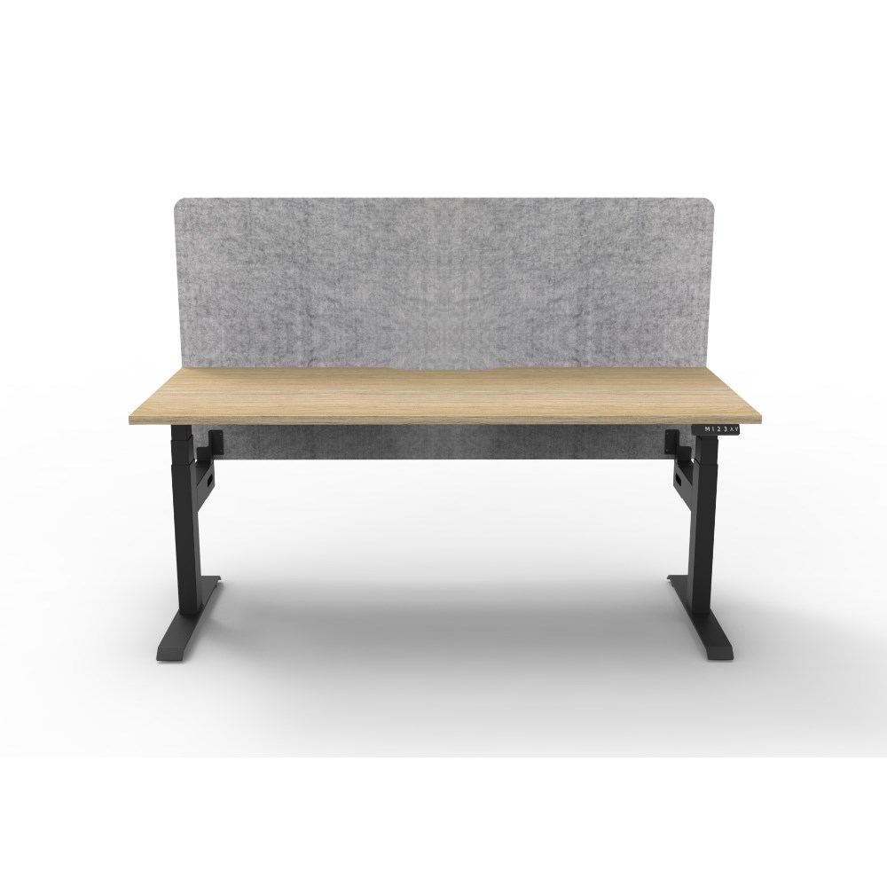 Natural Oak top with rigid edging and 50mm deep scallop cut out. Black Satin powder coat frame. Eco screen. Dimensions: 1200W x 750D x 620-1270mmH. Overall Height AFFL including screen 1330mmH. Black 1200W x 900H x 27mmT Eco Panel Screen. E0 25mmT rated top. Column size: 90mm x 60mm. Digital control panel with 3 presets, LED display, keypad safety lock and reminder alarm. Dual motor with anti-collision and anti-tilt technology. Lifting capacity 120kg, max speed 38mm per second. Adjustable levelling feet, foot size 700mm, desk mounting top plate size 500mm, steel gauge 3.0mm, 2.0mm and 1.5mm used throughout. Noise emission