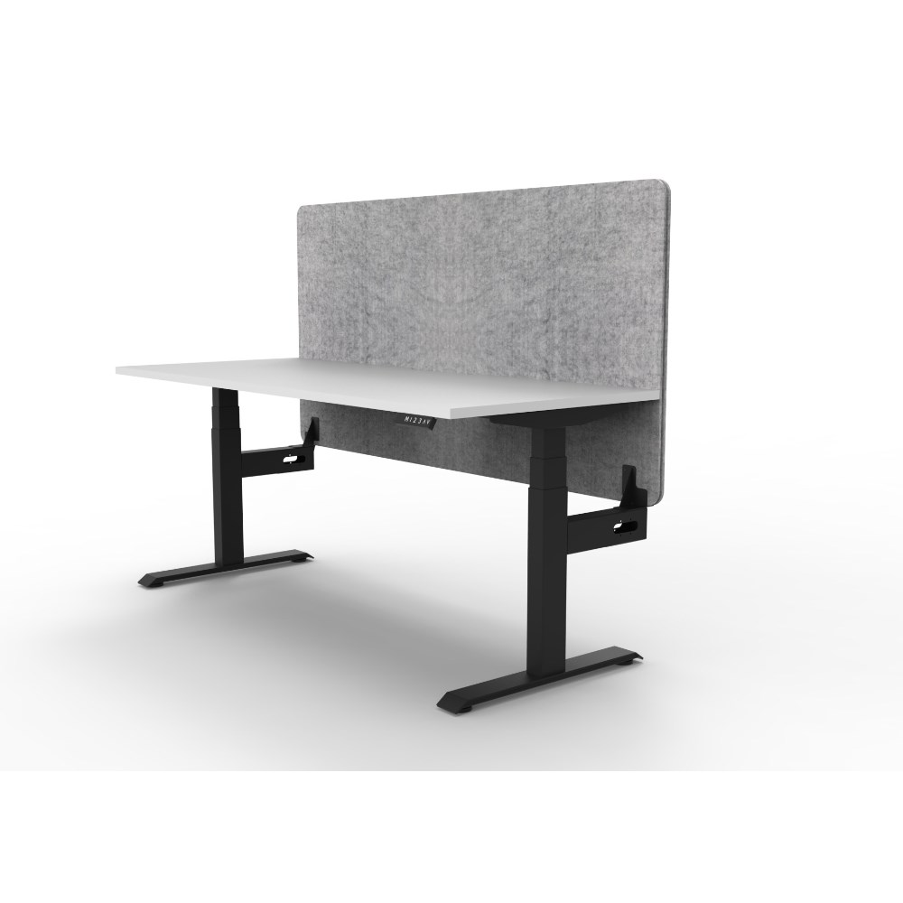Natural White top with rigid edging and 50mm deep scallop cut out. Black Satin powder coat frame. Eco screen. Dimensions: 1800W x 750D x 620-1270mmH. Overall Height AFFL including screen 1330mmH. Marble Grey 1800W x 900H x 27mmT Eco Panel Screen. E0 25mmT rated top. Column size: 90mm x 60mm. Digital control panel with 3 presets, LED display, keypad safety lock and reminder alarm. Dual motor with anti-collision and anti-tilt technology. Lifting capacity 120kg, max speed 38mm per second. Adjustable levelling feet, foot size 700mm, desk mounting top plate size 500mm, steel gauge 3.0mm, 2.0mm and 1.5mm used throughout. Noise emission