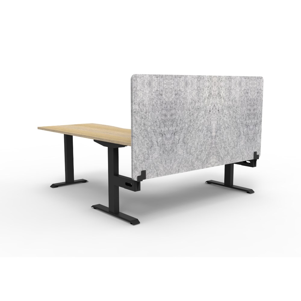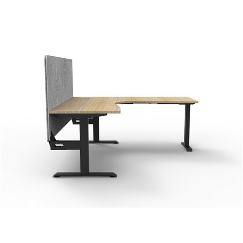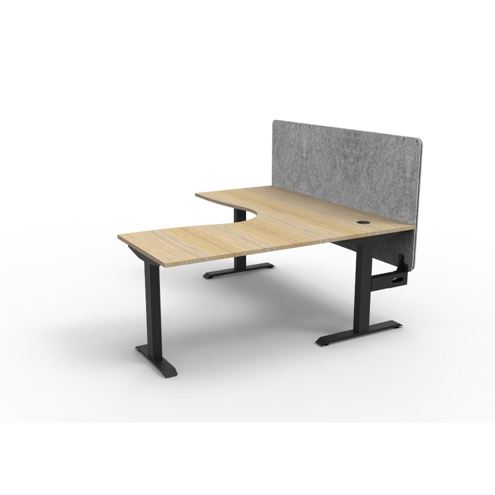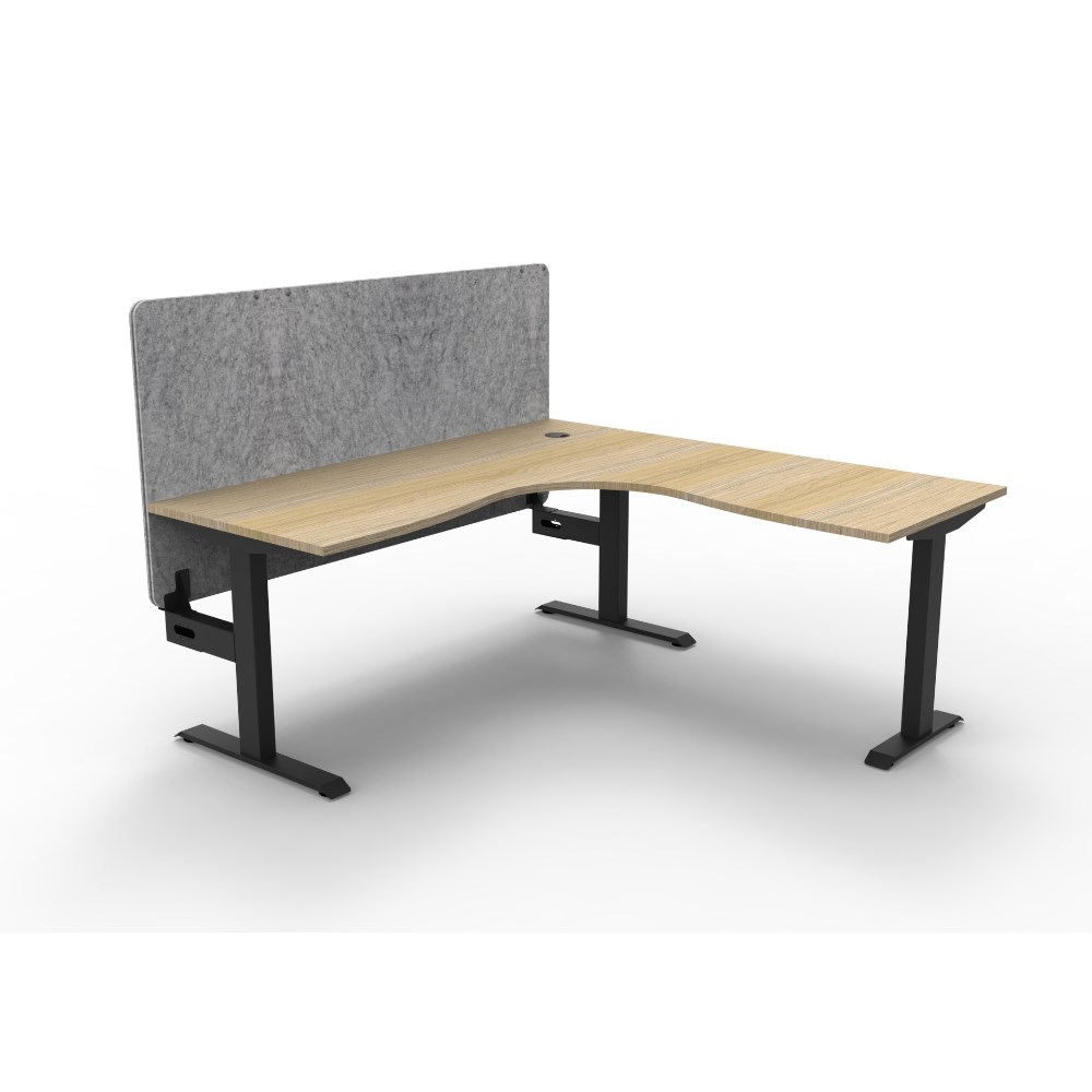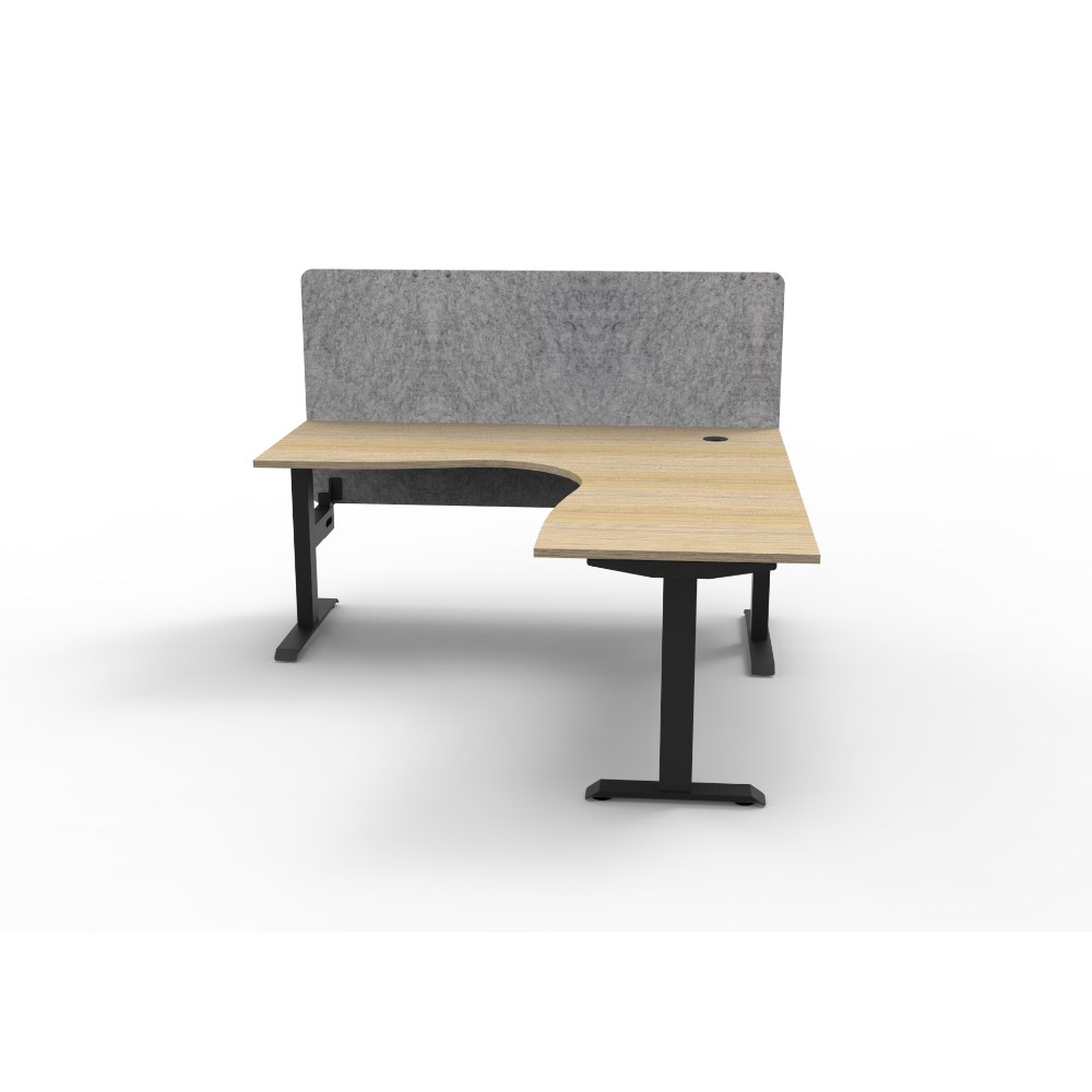 • Corner workstation with Natural Oak top and Black Satin frame, Grey Eco screen.