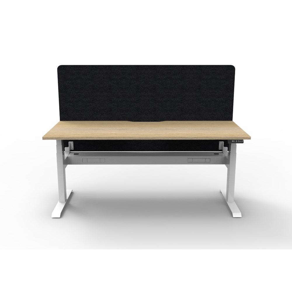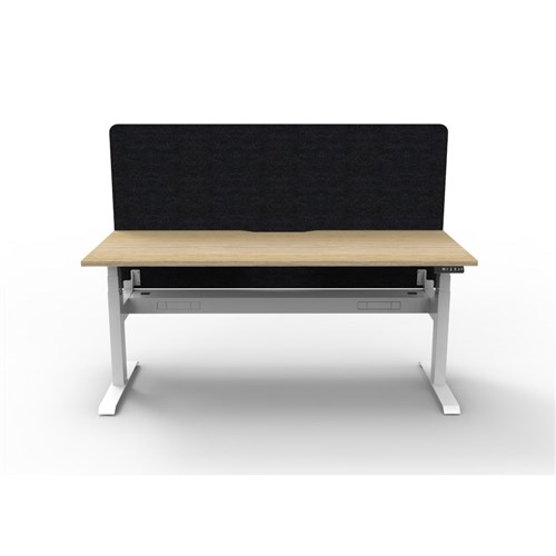 Natural Oak top with rigid edging and 50mm deep scallop cut out. White Satin powder coat frame. Eco screen and cable tray. Dimensions: 1200W x 750D x 620-1270mmH. Overall Height AFFL including screen 1330mmH. Black 1200W x 900H x 27mmT Eco Panel Screen. Fully ducted cable tray with punchouts for power and data, fitted to internal or external frame. E0 25mmT rated top. Column size: 90mm x 60mm. Digital control panel with 3 presets, LED display, keypad safety lock and reminder alarm. Dual motor with anti-collision and anti-tilt technology. Lifting capacity 120kg, max speed 38mm per second. Adjustable levelling feet, foot size 700mm, desk mounting top plate size 500mm, steel gauge 3.0mm, 2.0mm and 1.5mm used throughout. Noise emission