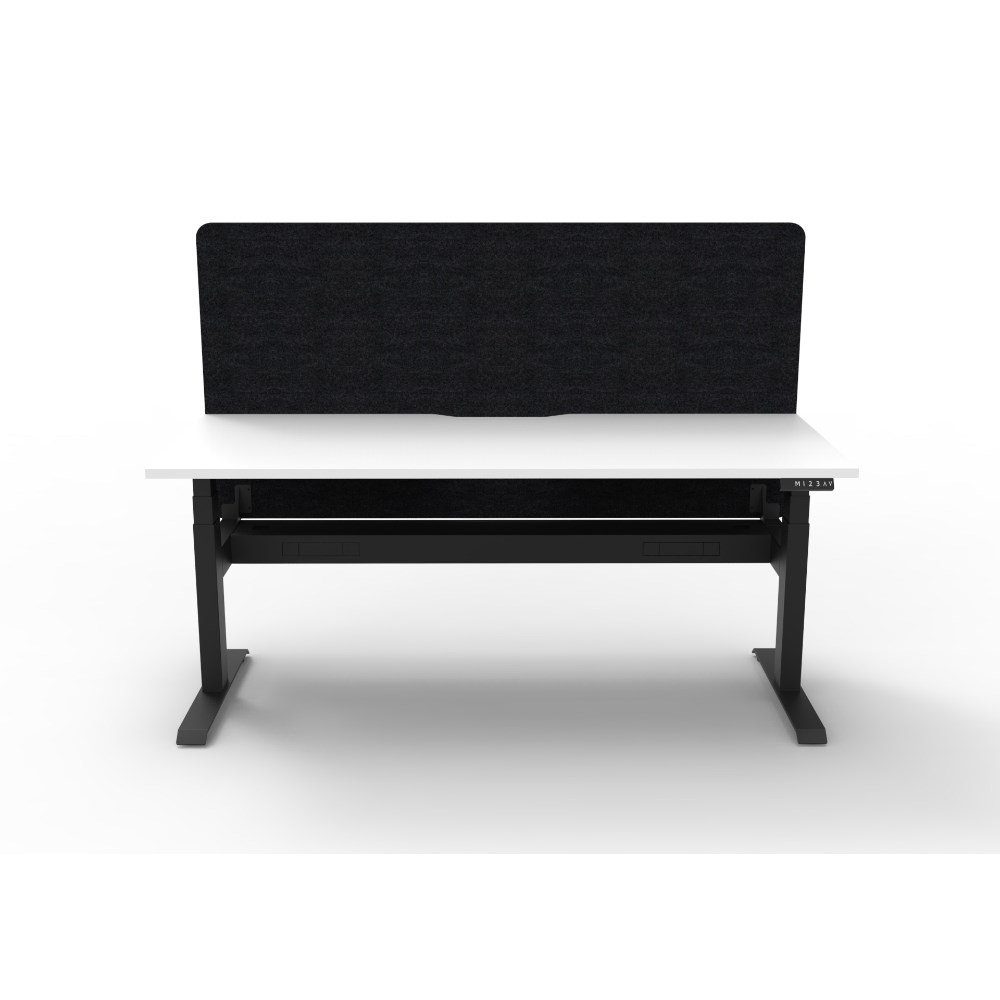 Natural White top with rigid edging and 50mm deep scallop cut out. Black Satin powder coat frame. Eco screen and cable tray. Dimensions: 1500W x 750D x 620-1270mmH. Overall Height AFFL including screen 1330mmH. Black 1500W x 900H x 27mmT Eco Panel Screen. Fully ducted cable tray with punchouts for power and data, fitted to internal or external frame. E0 25mmT rated top. Column size: 90mm x 60mm. Digital control panel with 3 presets, LED display, keypad safety lock and reminder alarm. Dual motor with anti-collision and anti-tilt technology. Lifting capacity 120kg, max speed 38mm per second. Adjustable levelling feet, foot size 700mm, desk mounting top plate size 500mm, steel gauge 3.0mm, 2.0mm and 1.5mm used throughout. Noise emission