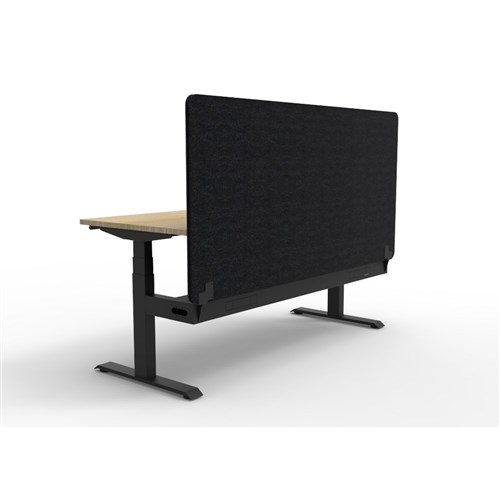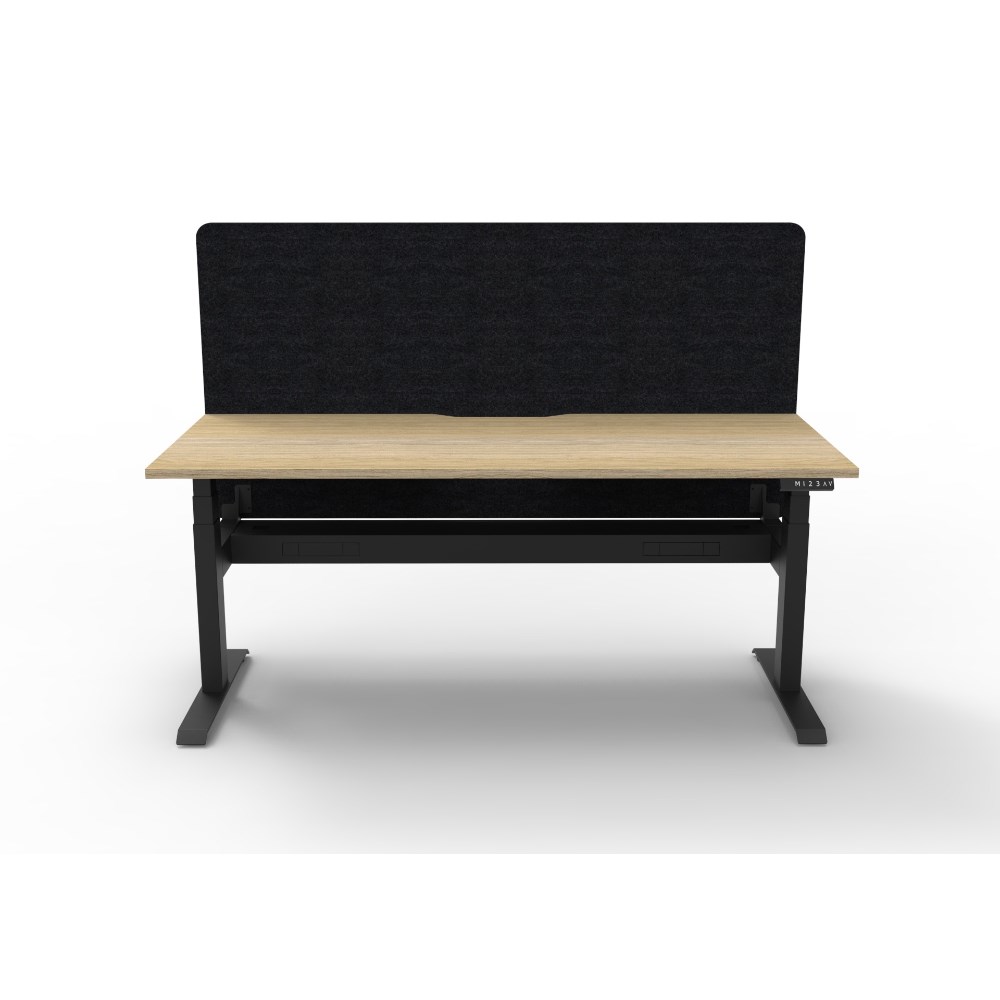 Natural Oak top with rigid edging and 50mm deep scallop cut out. Black Satin powder coat frame. Eco screen and cable tray. Dimensions: 1800W x 750D x 620-1270mmH. Overall Height AFFL including screen 1330mmH. Black 1800W x 900H x 27mmT Eco Panel Screen. Fully ducted cable tray with punchouts for power and data, fitted to internal or external frame. E0 25mmT rated top. Column size: 90mm x 60mm. Digital control panel with 3 presets, LED display, keypad safety lock and reminder alarm. Dual motor with anti-collision and anti-tilt technology. Lifting capacity 120kg, max speed 38mm per second. Adjustable levelling feet, foot size 700mm, desk mounting top plate size 500mm, steel gauge 3.0mm, 2.0mm and 1.5mm used throughout. Noise emission