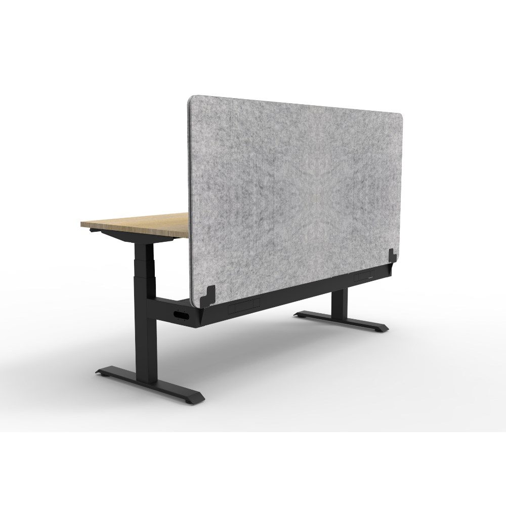 Natural Oak top with rigid edging and 50mm deep scallop cut out. Black Satin powder coat frame. Eco screen and cable tray. Dimensions: 1200W x 750D x 620-1270mmH. Overall Height AFFL including screen 1330mmH. Marble Grey 1200W x 900H x 27mmT Eco Panel Screen. Fully ducted cable tray with punchouts for power and data, fitted to internal or external frame. E0 25mmT rated top. Column size: 90mm x 60mm. Digital control panel with 3 presets, LED display, keypad safety lock and reminder alarm. Dual motor with anti-collision and anti-tilt technology. Lifting capacity 120kg, max speed 38mm per second. Adjustable levelling feet, foot size 700mm, desk mounting top plate size 500mm, steel gauge 3.0mm, 2.0mm and 1.5mm used throughout. Noise emission
