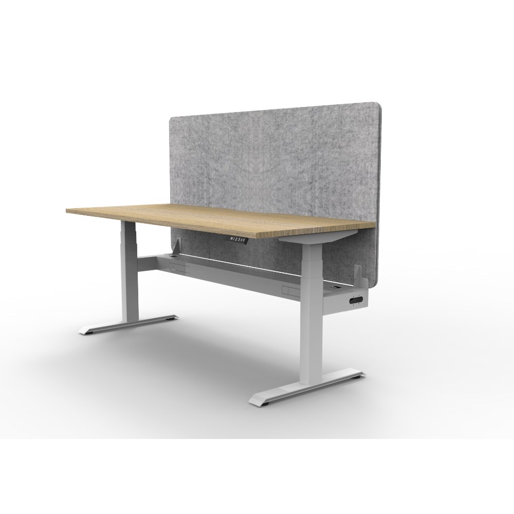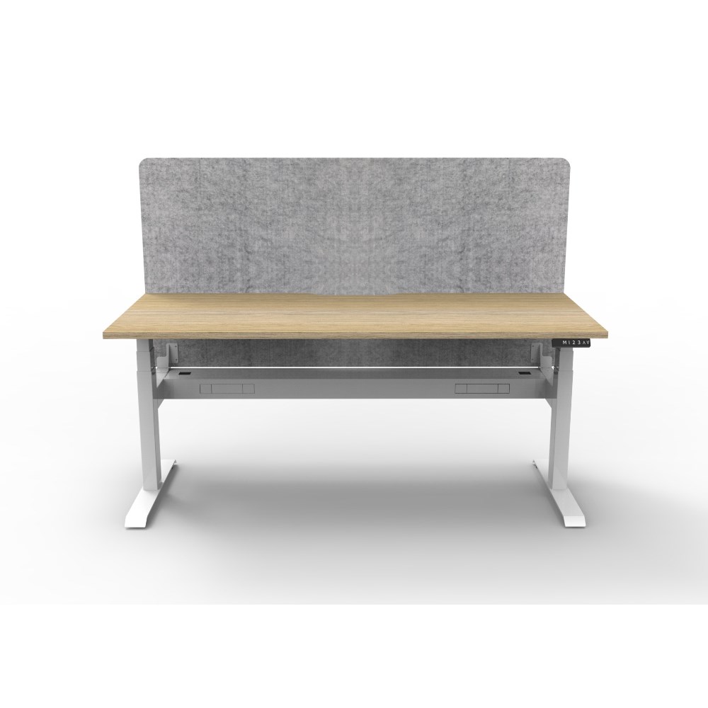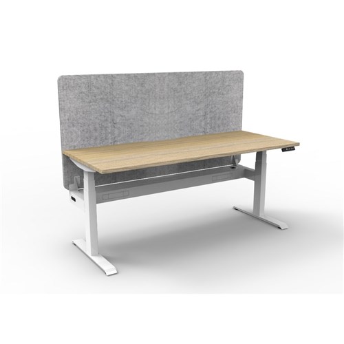 Natural Oak top with rigid edging and 50mm deep scallop cut out. White Satin powder coat frame. Eco screen and cable tray. Dimensions: 1500W x 750D x 620-1270mmH. Overall Height AFFL including screen 1330mmH. Marble Grey 1500W x 900H x 27mmT Eco Panel Screen. Fully ducted cable tray with punchouts for power and data, fitted to internal or external frame. E0 25mmT rated top. Column size: 90mm x 60mm. Digital control panel with 3 presets, LED display, keypad safety lock and reminder alarm. Dual motor with anti-collision and anti-tilt technology. Lifting capacity 120kg, max speed 38mm per second. Adjustable levelling feet, foot size 700mm, desk mounting top plate size 500mm, steel gauge 3.0mm, 2.0mm and 1.5mm used throughout. Noise emission