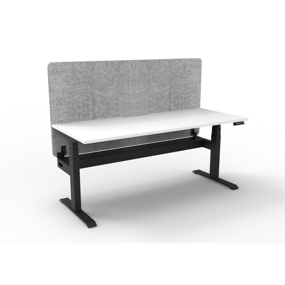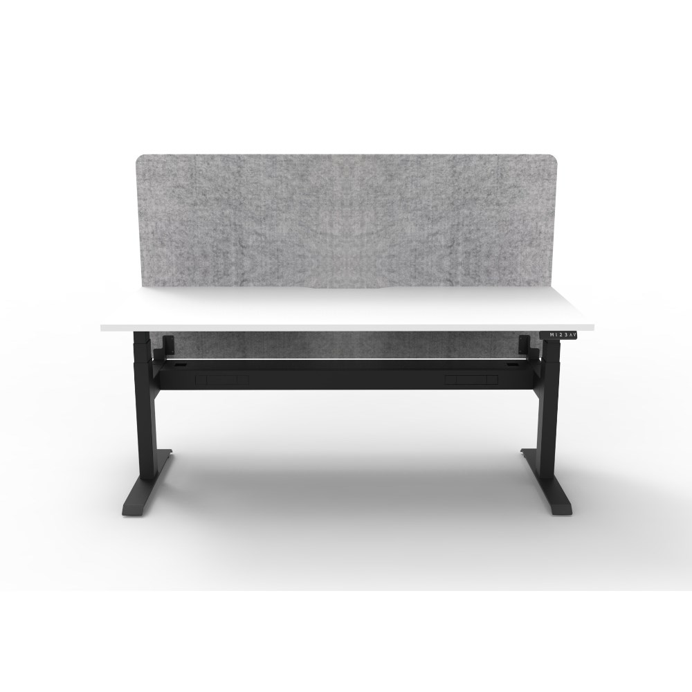 Natural White top with rigid edging and 50mm deep scallop cut out. Black Satin powder coat frame. Eco screen and cable tray. Dimensions: 1500W x 750D x 620-1270mmH. Overall Height AFFL including screen 1330mmH. Marble Grey 1500W x 900H x 27mmT Eco Panel Screen. Fully ducted cable tray with punchouts for power and data, fitted to internal or external frame. E0 25mmT rated top. Column size: 90mm x 60mm. Digital control panel with 3 presets, LED display, keypad safety lock and reminder alarm. Dual motor with anti-collision and anti-tilt technology. Lifting capacity 120kg, max speed 38mm per second. Adjustable levelling feet, foot size 700mm, desk mounting top plate size 500mm, steel gauge 3.0mm, 2.0mm and 1.5mm used throughout. Noise emission