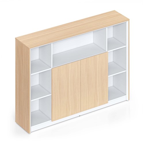 Natural Oak outer carcass and swing doors with Natural White inner profiles. Dimensions: 1800mm W x 400mm D x 1250mm H. 1 x double swing door cupboard with 1 x adjustable shelf inside. 6 x storage cubes 354W x 354D x 363mmH. 1 x storage opening 966W x 354D x 362mmH. Featuring a combination of open shelving, enclosed storage, and cubbies, this unit provides ample space for books, decor and other essentials. 5 Year Manufacturer's Warranty. Delivery, installation and assembly charges may apply to furniture. Please enquire to confirm.