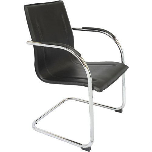 Classic visitor chair upholstered in easy to clean black PU material. Chrome cantilever frame and arms, with padded armrests. Chair Dimensions Overall: 510W x 490D x 510mmH. Seat Height: 460mmH. Chair Capacity : 110Kg. Indicative Seating Time : 4 hours. 3 Year Manufacturer's Warranty. Delivery, installation and assembly charges may apply to furniture. Please enquire to confirm.