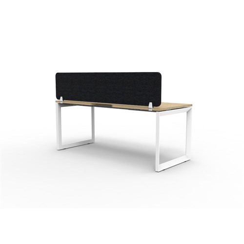Natural Oak worksurface with rigid edging and 410mmW x 50mmD scallop cable access. White Satin powder coat frame. Eco screen. Overall Including Screen: 1200W x 780D x 730mmH. Per User: 1200W x 750D x 730mmH. Overall Height including screen 1130mmH. Black 1200W x 400H x 27mmT Eco Panel Screen. 60mm x 45mm bevelled edge loop legs. Dual cross bar for added stability. E0 rated Enviroboard melamine worksurface. Adjustable levelling feet. AFRDI certified. 5 Year Manufacturer's Warranty. Delivery, installation and assembly charges may apply to furniture. Please enquire to confirm.