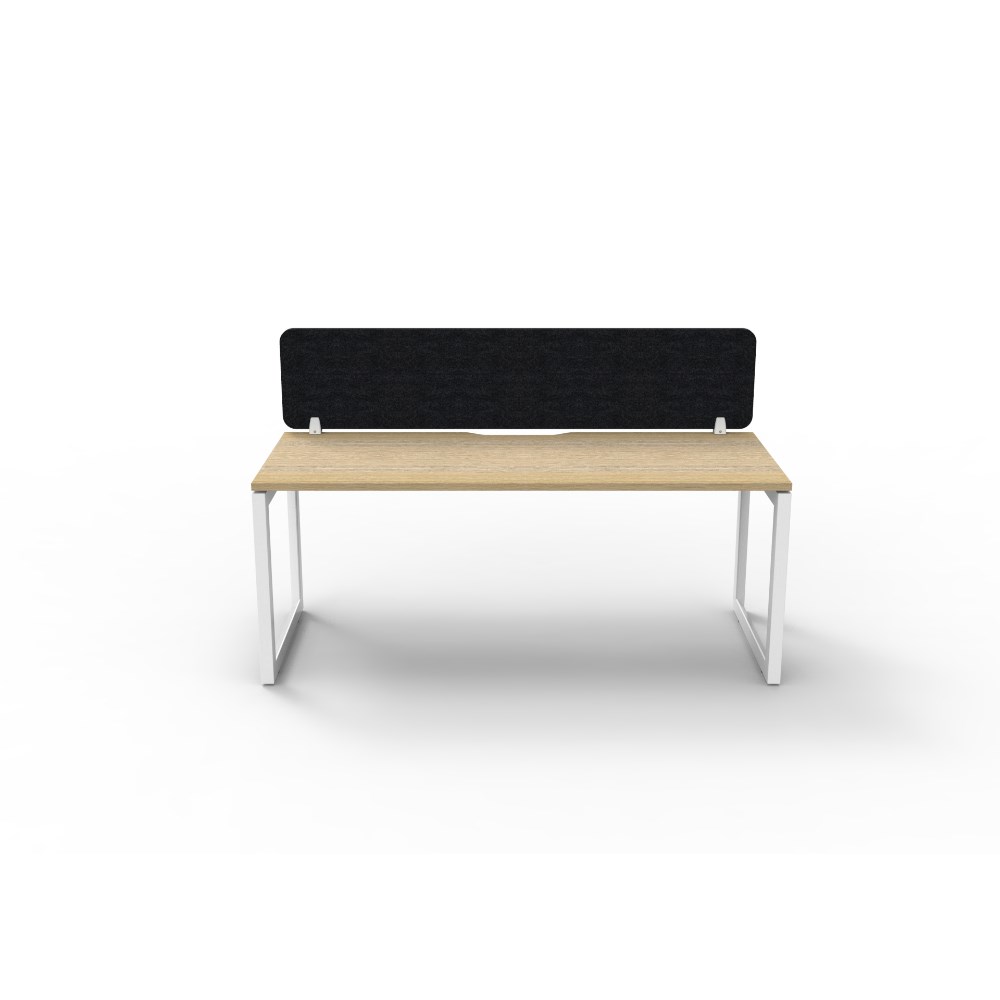 Natural Oak worksurface with rigid edging and 410mmW x 50mmD scallop cable access. White Satin powder coat frame. Eco screen. Overall Including Screen: 1500W x 780D x 730mmH. Per User: 1500W x 750D x 730mmH. Overall Height including screen 1130mmH. Black 1500W x 400H x 27mmT Eco Panel Screen. 60mm x 45mm bevelled edge loop legs. Dual cross bar for added stability. E0 rated Enviroboard melamine worksurface. Adjustable levelling feet. AFRDI certified. 5 Year Manufacturer's Warranty. Delivery, installation and assembly charges may apply to furniture. Please enquire to confirm.