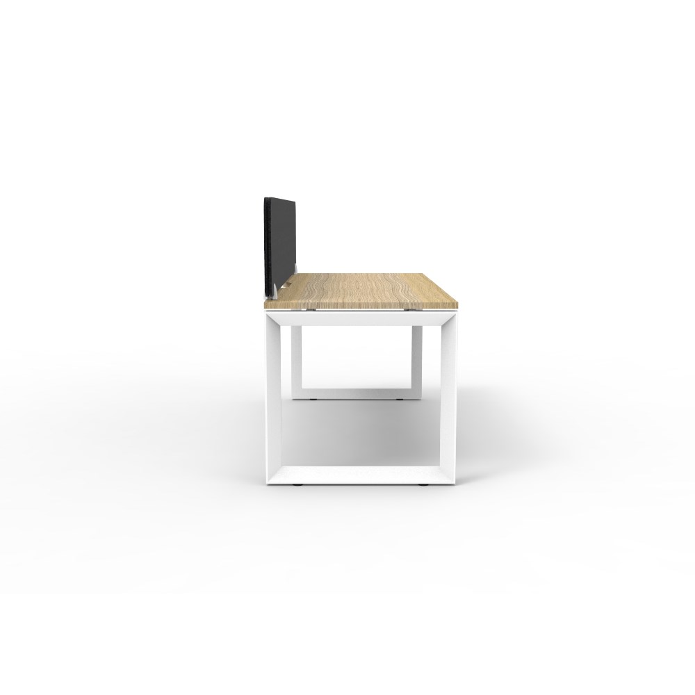 Natural Oak worksurface with rigid edging and 410mmW x 50mmD scallop cable access. White Satin powder coat frame. Eco screen. Overall Including Screen: 1800W x 780D x 730mmH. Per User: 1800W x 750D x 730mmH. Overall Height including screen 1130mmH. Black 1800W x 400H x 27mmT Eco Panel Screen. 60mm x 45mm bevelled edge loop legs. Dual cross bar for added stability. E0 rated Enviroboard melamine worksurface. Adjustable levelling feet. AFRDI certified. 5 Year Manufacturer's Warranty. Delivery, installation and assembly charges may apply to furniture. Please enquire to confirm.