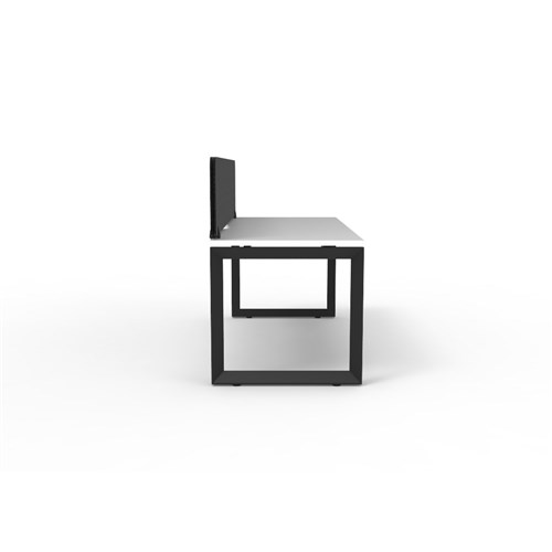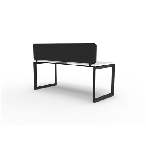 Natural White worksurface with rigid edging and 410mmW x 50mmD scallop cable access. Black Satin powder coat frame. Eco screen. Overall Including Screen: 1800W x 780D x 730mmH. Per User: 1800W x 750D x 730mmH. Overall Height including screen 1130mmH. Black 1800W x 400H x 27mmT Eco Panel Screen. 60mm x 45mm bevelled edge loop legs. Dual cross bar for added stability. E0 rated Enviroboard melamine worksurface. Adjustable levelling feet. AFRDI certified. 5 Year Manufacturer's Warranty. Delivery, installation and assembly charges may apply to furniture. Please enquire to confirm.
