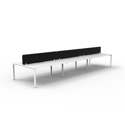 6 person double sided workstation with White top and White Satin frame, Black Eco screen. Unit Dimension: 3600W x 1530D x 1200mmH (Overall). Per user: 1200W x 750D x 730mmH. Eco panel screen 400mmH x 27mmT with 4 x 50mm radius corners. 410mmW x 50mmD scallop cable access. E0 Enviroboard melamine worksurface. 60mm x 30mm powder coated profile leg underframe with dual cross bar for added stability. Adjustable levelling feet. AFRDI. 5 Year Manufacturer's Warranty. Delivery, installation and assembly charges may apply to furniture. Please enquire to confirm.