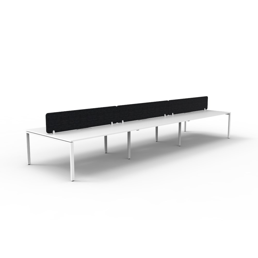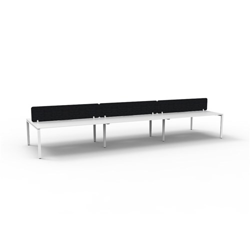 6 person double sided workstation with White top and White Satin frame, Black Eco screen. Unit Dimension: 4500W x 1530D x 1200mmH (Overall). Per user: 1500W x 750D x 730mmH. Eco panel screen 400mmH x 27mmT with 4 x 50mm radius corners. 410mmW x 50mmD scallop cable access. E0 Enviroboard melamine worksurface. 60mm x 30mm powder coated profile leg underframe with dual cross bar for added stability. Adjustable levelling feet. AFRDI. 5 Year Manufacturer's Warranty. Delivery, installation and assembly charges may apply to furniture. Please enquire to confirm.