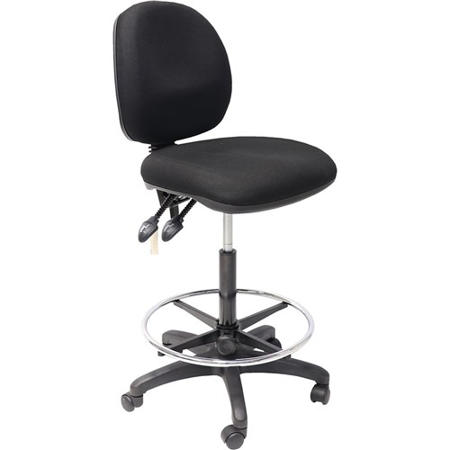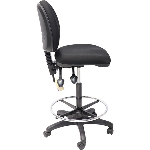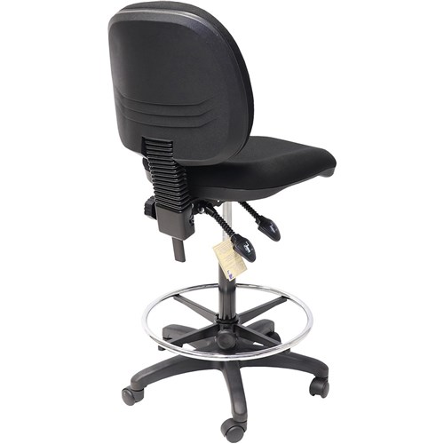 Medium back drafting chair with gas lift, back tilt, injection moulded foam. Foot ring. Semi ergonomic. 2 levers. Chair Dimensions: Seat 500W x 450D x Back 430H x Seat 630-800mmH. Weight Rating: 120 Kg. AFRDI approved at Level 6 for severe commercial use. 3 Year Manufacturer's Warranty.
