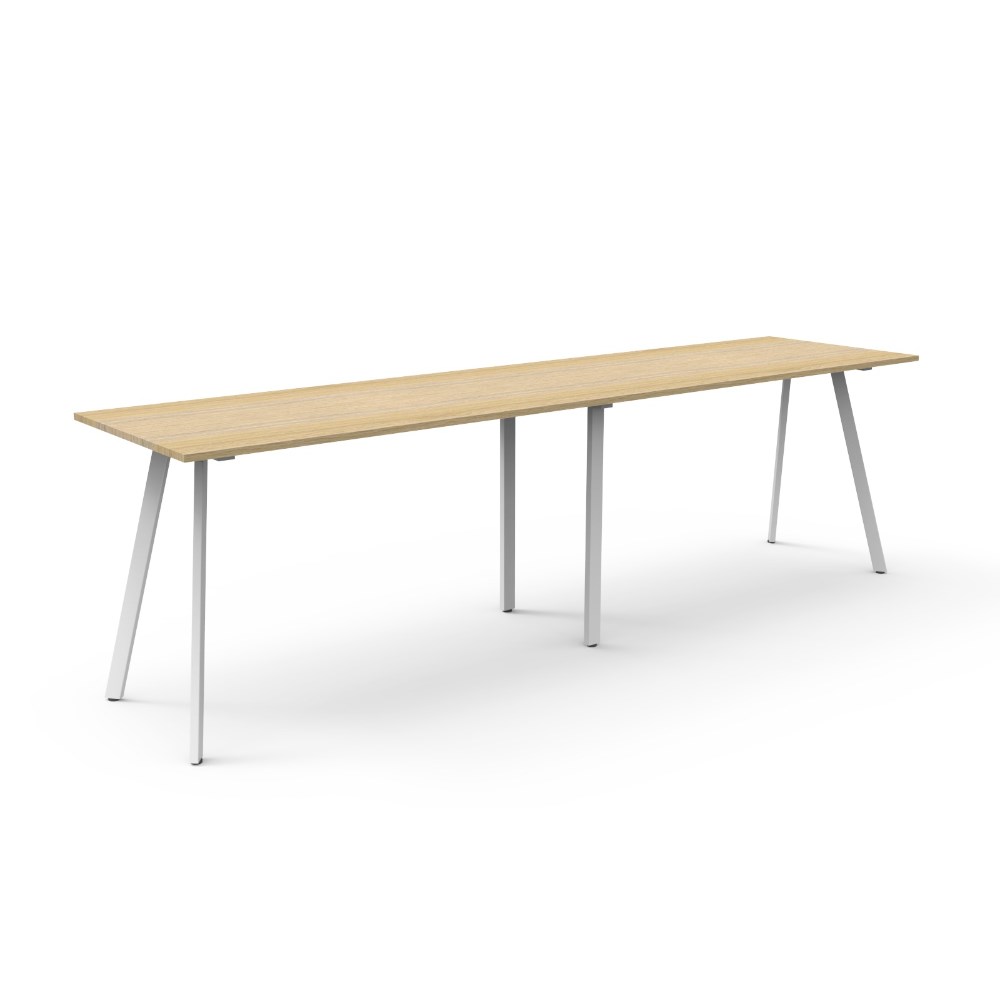 Natural Oak top white frame. Dimensions: 3600W x 900D x 1050mmH. 60mm x 30mm splayed leg underframe. Matches with the Eternity range. Dual cross bar for added stability. E1 enviroboard melamine worksurface. Adjustable levelling feet. 5 Year Manufacturer's Warranty. Delivery, installation and assembly charges may apply to furniture. Please enquire to confirm.
