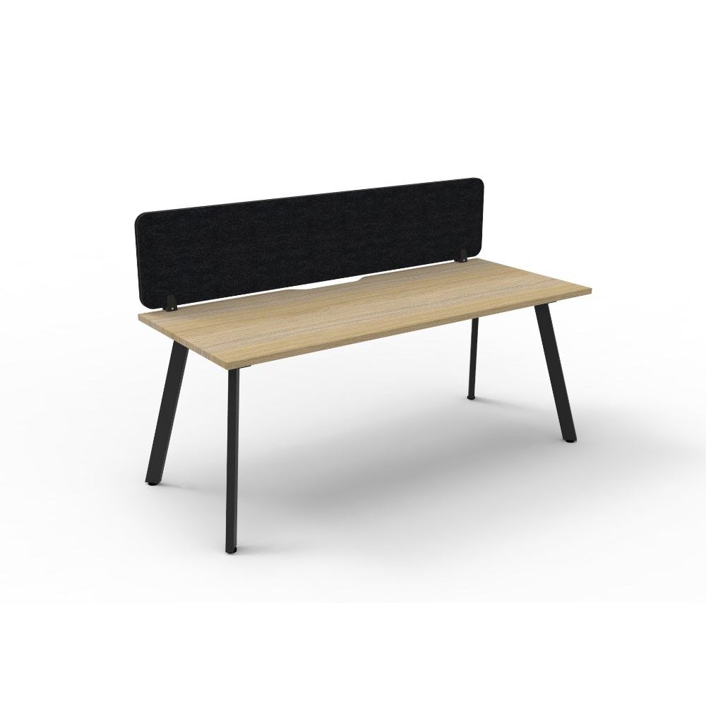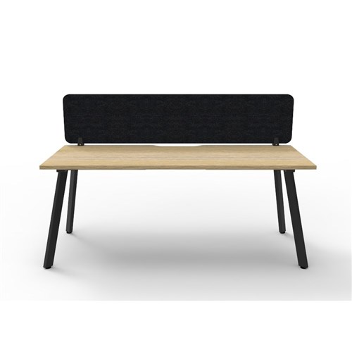 Natural Oak worksurface with rigid edging and 410mmW x 50mmD scallop cable access. Black Satin powder coat frame. Eco screen. Dimensions: 1500W x 780D x 730mmH. Overall Height including screen 1130mmH. Black 1500W x 400H x 27mmT Eco panel screen with 4 x 50mm radius corners. E0 rated 25mmT Enviroboard melamine top. 60mm x 30mm splayed legs. Dual cross bar construction for added stability. Adjustable levelling feet for stability on uneven floors. AFRDI certified. 5 Year Manufacturer?s Warranty. Delivery, installation and assembly charges may apply. Please enquire to confirm.