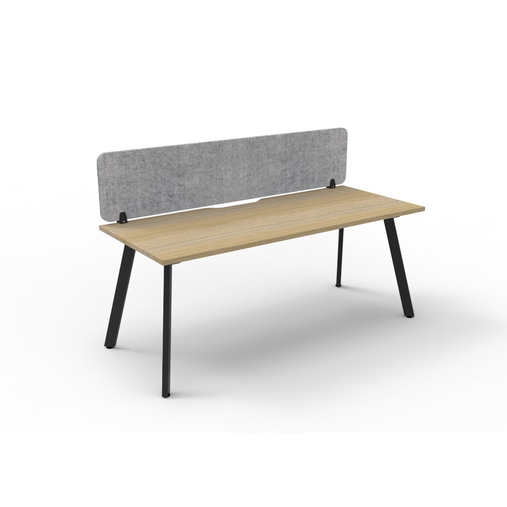 Natural Oak worksurface with rigid edging and 410mmW x 50mmD scallop cable access. Black Satin powder coat frame. Eco screen. Dimensions: 1500W x 780D x 730mmH. Overall Height including screen 1130mmH. Marble Grey 1500W x 400H x 27mmT Eco panel screen with 4 x 50mm radius corners. E0 rated 25mmT Enviroboard melamine top. 60mm x 30mm splayed legs. Dual cross bar construction for added stability. Adjustable levelling feet for stability on uneven floors. AFRDI certified. 5 Year Manufacturer?s Warranty. Delivery, installation and assembly charges may apply. Please enquire to confirm.