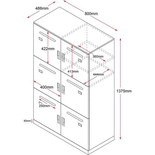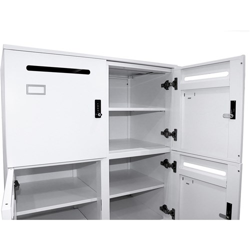 6 lockable individual compartments. Mail or document slot and adjustable shelf. Name tag holder fitted to each door. Powder coated finish. 4 digit combination lock fitted to each door with both private and public functions. 1 x master key provided with each unit. Individual locker size 360W x 470D x 420mmH. Unit Dimension: 800W x 486D x 1375mmH. 10 Year Manufacturer's Warranty. Delivery, installation and assembly charges may apply to furniture. Please enquire to confirm.