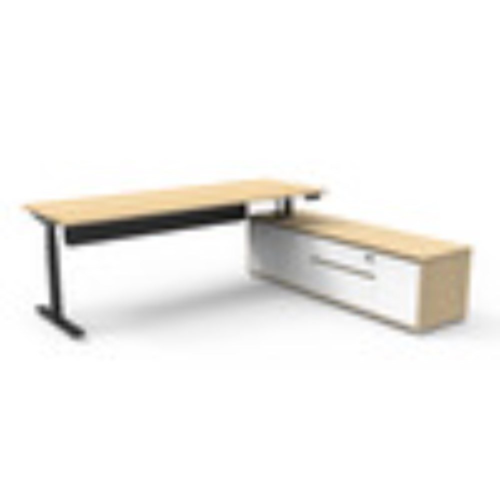 Natural Oak top and Black Satin frame. Height adjustable desk with modesty panel and right hand side cabinet. Desk Dimensions: 2100W x 750D x 620-1270mmH. Side Cabinet Dimensions: 1800W x 500D x 520mmH. Overall Footprint: 2270W x 1936mmD. Offers a spacious configuration with an eye-catching finish. A height-adjustable desk that incorporates dual motors for smooth and quiet operation, allowing you to effortlessly adjust to your preferred working position. Equipped with 3 pre-set positions and anti-collision technology, it ensures safe and reliable use. The integrated side cabinet provides ample storage with drawers and cupboards, enhancing workspace organisation and keeping your essentials within easy reach. Powder coated legs. 2 x pull out drawers. 1 x double swing door cupboard. 10 Year Manufacturer's Warranty. Delivery, installation and assembly charges may apply to furniture. Please enquire to confirm.