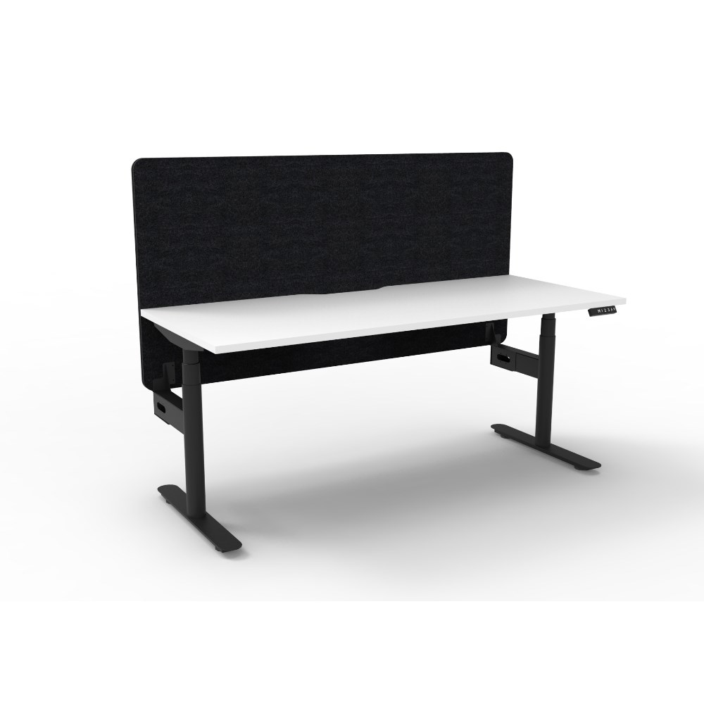 Natural White worksurface with rigid edging and 50mm scallop cable cut out. E0 rated 25mmT top. Black Satin powder coat round-leg frame. Eco screen. Overall: 1500W x 750D x 620-1270mmH. Overall Height including screen: 1330mmH. Black Eco Panel Screen 1500W x 900H x 27mmT. Digital control panel with 3 preset positions, LED display, keypad lock and reminder alarm. Dual motor with anti-collision and anti-tilt technology. Lifting capacity 120kg, max speed 38mm per second. Column size 70mm diameter. Adjustable levelling feet. Noise
