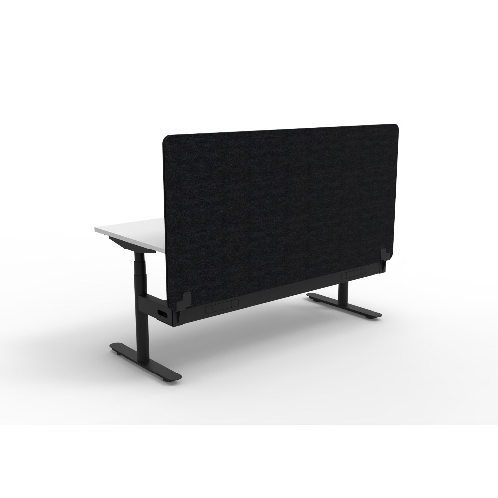 Natural White worksurface with rigid edging and 50mm scallop cable cut out. E0 rated 25mm top. Black Satin powder coat round-leg frame. Eco screen and cable tray. Overall: 1200W x 750D x 620-1270mmH. Overall height including screen: 1330mmH. Black Eco Panel Screen 1200W x 900H x 27mmT. Fully ducted cable tray with punchout for power and data to be fitted to either external or internal of frame. Column Size: 70mm diameter. Digital control panel with 3 preset positions, LED display, keypad safety lock and reminder alarm. Anti-collision and anti-tilt technology with adjustable levelling feet. Noise emission: