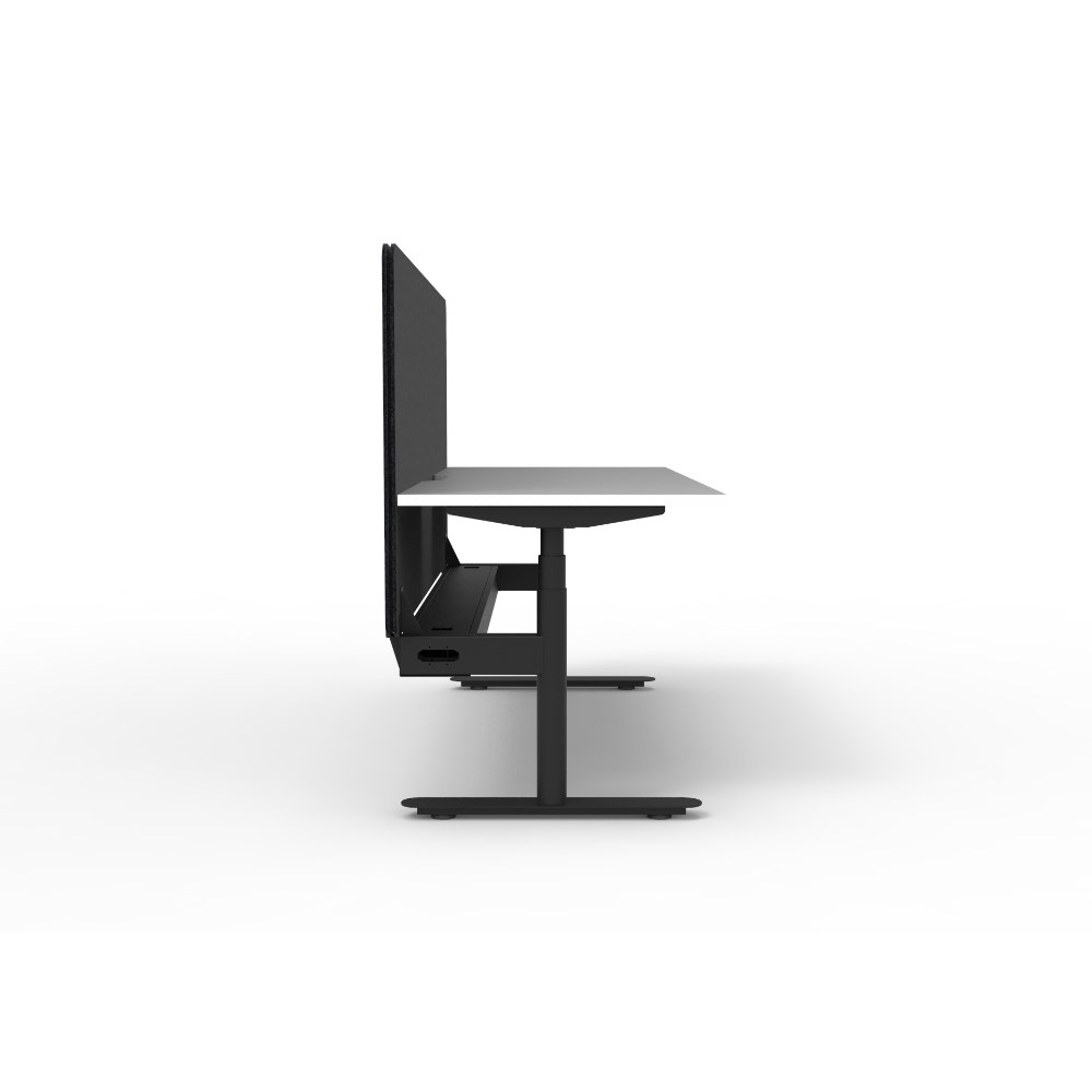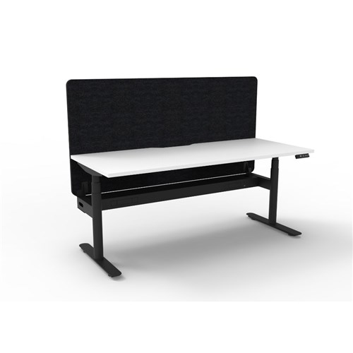 Natural White worksurface with rigid edging and 50mm scallop cable cut out. E0 rated 25mm top. Black Satin powder coat round-leg frame. Eco screen and cable tray. Overall: 1500W x 750D x 620-1270mmH. Overall height including screen: 1330mmH. Black Eco Panel Screen 1500W x 900H x 27mmT. Fully ducted cable tray with punchout for power and data to be fitted to either external or internal of frame. Column Size: 70mm diameter. Digital control panel with 3 preset positions, LED display, keypad safety lock and reminder alarm. Anti-collision and anti-tilt technology with adjustable levelling feet. Noise emission: