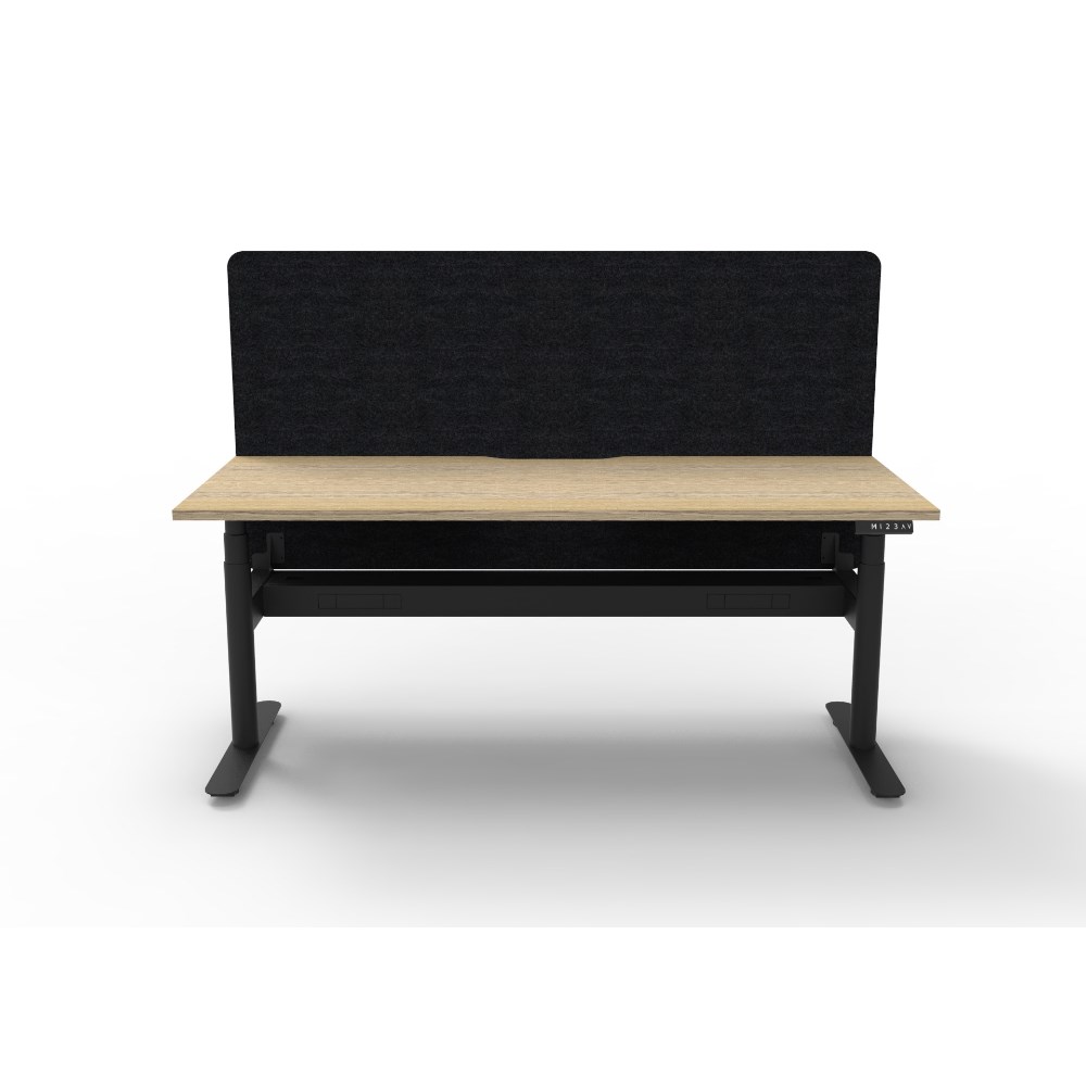 Natural Oak worksurface with rigid edging and 50mm scallop cable cut out. E0 rated 25mm top. Black Satin powder coat round-leg frame. Eco screen and cable tray. Overall: 1800W x 750D x 620-1270mmH. Overall height including screen: 1330mmH. Black Eco Panel Screen 1800W x 900H x 27mmT. Fully ducted cable tray with punchout for power and data to be fitted to either external or internal of frame. Column Size: 70mm diameter. Digital control panel with 3 preset positions, LED display, keypad safety lock and reminder alarm. Anti-collision and anti-tilt technology with adjustable levelling feet. Noise emission: