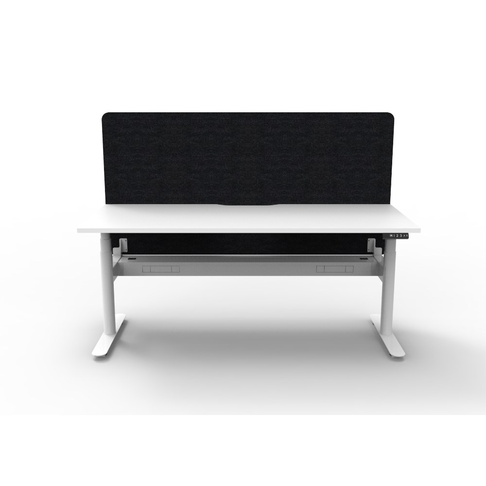 Natural White worksurface with rigid edging and 50mm scallop cable cut out. E0 rated 25mm top. White Satin powder coat round-leg frame. Eco screen and cable tray. Overall: 1800W x 750D x 620-1270mmH. Overall height including screen: 1330mmH. Black Eco Panel Screen 1800W x 900H x 27mmT. Fully ducted cable tray with punchout for power and data to be fitted to either external or internal of frame. Column Size: 70mm diameter. Digital control panel with 3 preset positions, LED display, keypad safety lock and reminder alarm. Anti-collision and anti-tilt technology with adjustable levelling feet. Noise emission: