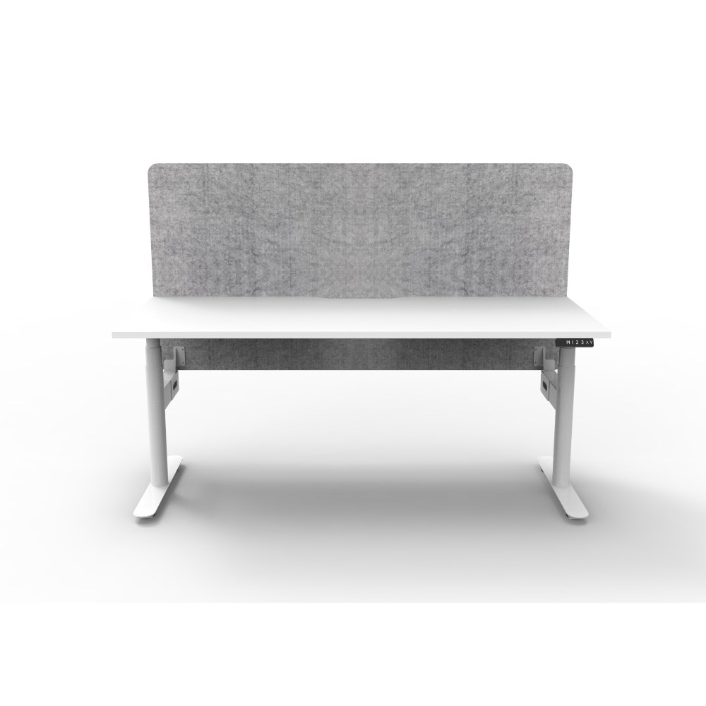 Natural White worksurface with rigid edging and 50mm scallop cable cut out. E0 rated 25mmT top. White Satin powder coat round-leg frame. Eco screen. Overall: 1800W x 750D x 620-1270mmH. Overall Height including screen: 1330mmH. Marble Grey Eco Panel Screen 1800W x 900H x 27mmT. Digital control panel with 3 preset positions, LED display, keypad lock and reminder alarm. Dual motor with anti-collision and anti-tilt technology. Lifting capacity 120kg, max speed 38mm per second. Column size 70mm diameter. Adjustable levelling feet. Noise