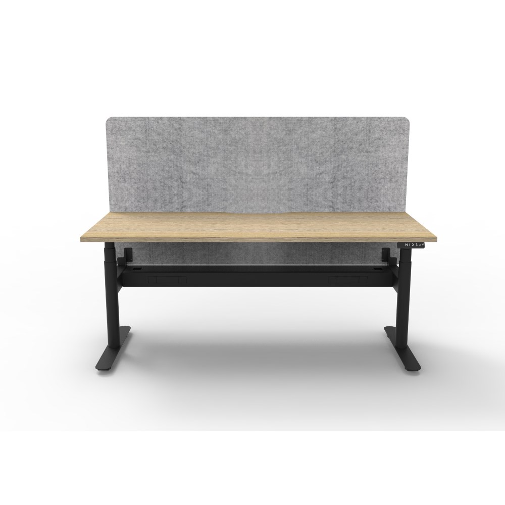 Natural Oak worksurface with rigid edging and 50mm scallop cable cut out. E0 rated 25mm top. Black Satin powder coat round-leg frame. Eco screen and cable tray. Overall: 1500W x 750D x 620-1270mmH. Overall height including screen: 1330mmH. Marble Grey Eco Panel Screen 1500W x 900H x 27mmT. Fully ducted cable tray with punchout for power and data to be fitted to either external or internal of frame. Column Size: 70mm diameter. Digital control panel with 3 preset positions, LED display, keypad safety lock and reminder alarm. Anti-collision and anti-tilt technology with adjustable levelling feet. Noise emission: