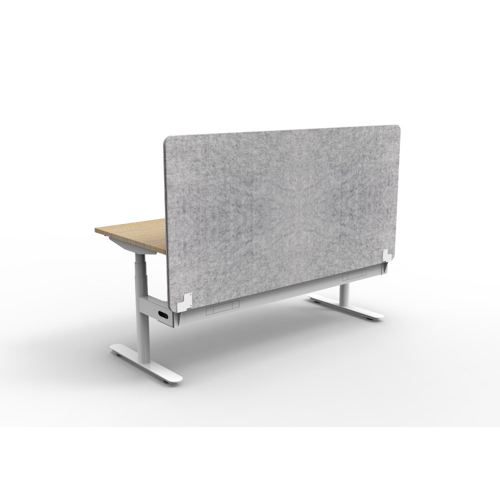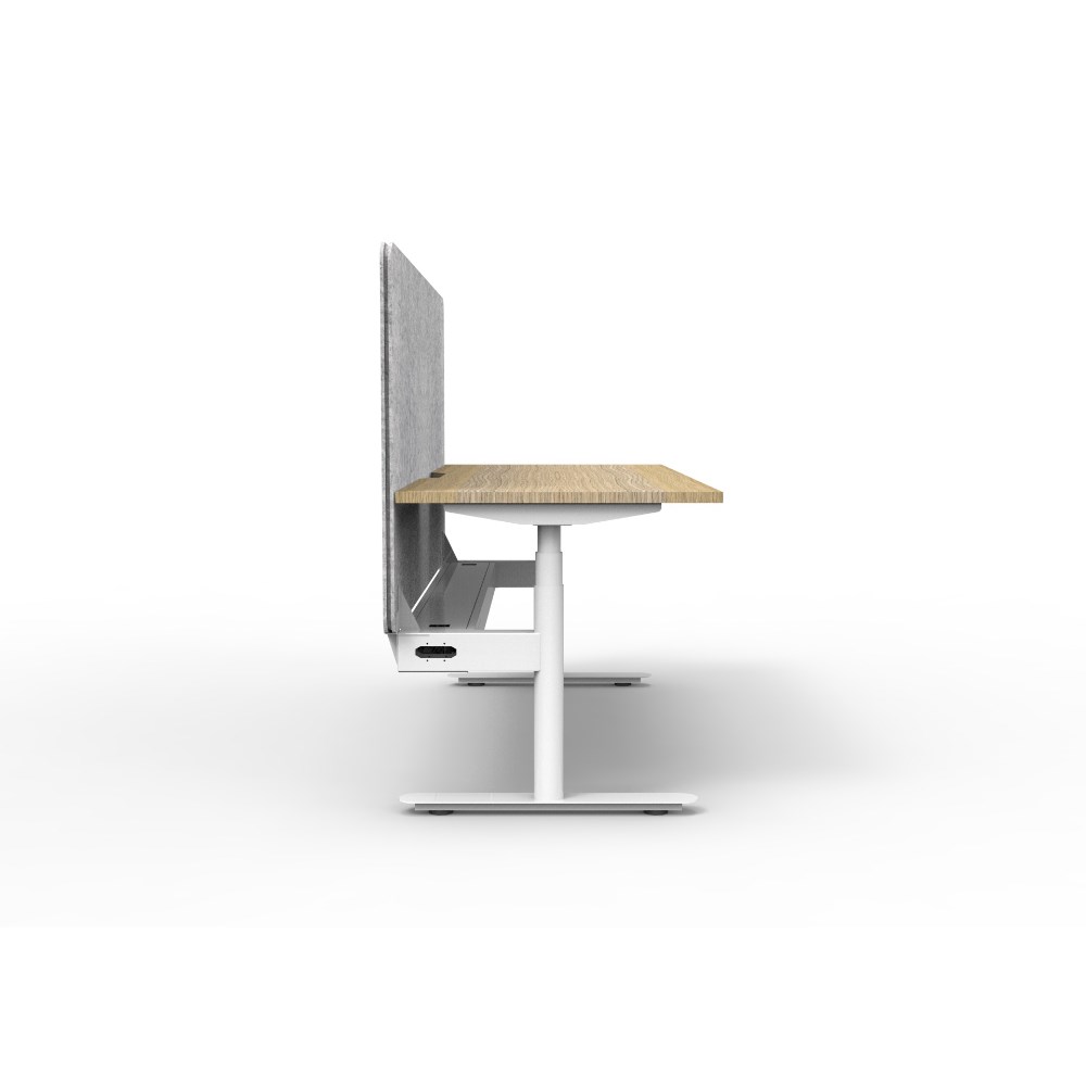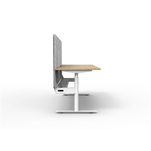 Natural Oak worksurface with rigid edging and 50mm scallop cable cut out. E0 rated 25mm top. White Satin powder coat round-leg frame. Eco screen and cable tray. Overall: 1800W x 750D x 620-1270mmH. Overall height including screen: 1330mmH. Marble Grey Eco Panel Screen 1800W x 900H x 27mmT. Fully ducted cable tray with punchout for power and data to be fitted to either external or internal of frame. Column Size: 70mm diameter. Digital control panel with 3 preset positions, LED display, keypad safety lock and reminder alarm. Anti-collision and anti-tilt technology with adjustable levelling feet. Noise emission: